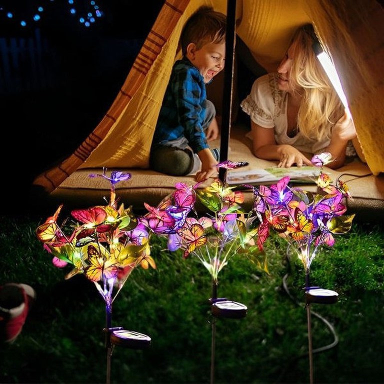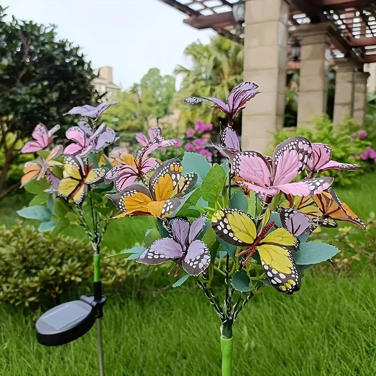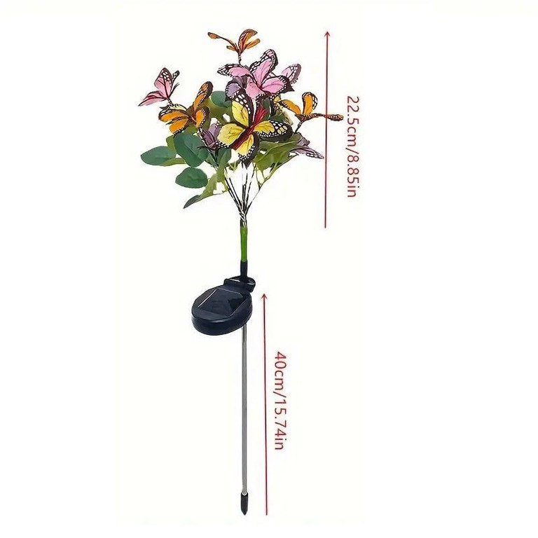 Lampa Solara cu Fluturi Multicolori pentru Gradina sau Terasa, IP65, cu Senzor de Lumina, 65cm Inaltime/nDecoreaza-ti gradina pentru seri frumoase de vara! Bucurati-va de sedintele si cinele in aer liber privind fluturii incantatori care prind viata cu ajutorul energiei solare. Va veti simti revigorat si incantat./nDecor pentru GradinaInveseleste-ti gradina cu aceste lampi solare extraordinare cu fluturi, care adauga o nota de fantezie si farmec oricarui cadru exterior. Impresioneaza-ti oaspetii cu designul lor unic, creand in acelasi timp o ambianta magica in gradina ta. Fiecare fluture este delicat realizat pentru a parea cat mai real./nPanou Solar Eficient pentru Iluminare pe Toata Durata NoptiiFLUTIX este echipat cu un panou solar de inalta eficienta. Cu o baterie imbunatatita de 600 mAh, care absoarbe multa lumina naturala in timpul zilei – aceste lumini asigura ore de lucru mai lungi si ofera o iluminare stralucitoare pe tot parcursul noptii. Panourile solare sunt concepute pentru a capta la maximum lumina solara si a o converti in energie pentru iluminatul pe toata durata noptii./nAfisaj Vizual UimitorCu fluturi din material textil ce par reali si lumini LED multicolore, aceste lampi solare pentru gradina sunt sigure ca vor incanta si uimi. Adauga un strop de fantezie in decorul gradinii tale cu designul lor unic. Luminile LED sunt eficiente energetic si emit o stralucire calda si primitoare./nRezistente la IntemperiiRealizate cu rezistenta la apa IP65, acestea rezista conditiilor meteorologice dure. Sunt echipate cu un comutator posterior impermeabil din cauciuc de inalta calitate, care rezista interferentelor de la apa si praf. Fii sigur ca vor straluci in gradina ta ani de zile./nTija Puternica si Rezistenta la RuginaTija care vine infipta in sol este din aluminiu lustruit si rezistenta la coroziune si rugina asigura stabilitate si durabilitate de lunga durata pentru utilizarea in aer liber. Asezati-le in pamant sau folositi-le ca lumini pentru a va ghida prin gradina dumneavoastra./nInstalare Fara FirPur si simplu plasati tijele metalice in pamant unde pot absorbi lumina soarelui, porniti-le si lasati panourile solare sa se incarce in mod natural. Aceste lampi se activeaza automat in intuneric, oferind pana la 12 ore de iluminare dupa doar 6-8 ore de incarcare./nAplicatie LargaIdeale pentru gradini, peluze, alei, curti si multe altele, aceste lampi cu fluturi aduc o lumina minunata si creeaza o ambianta romantica si festiva oriunde sunt amplasate. Folositi-le pentru a ilumina caile de acces, pentru a decora petreceri in aer liber sau pentru a spori frumusetea peisajului din gradina dvs./nDoua Moduri de Iluminare pentru o Ambianta MagicaPersonalizati stralucirea gradinii dvs. cu cele doua moduri ale luminii solare cu fluturi. Alegeti intre o lumina constanta pentru o atmosfera calma si senina sau un mod intermitent pentru o vibratie vie si festiva. Aceste doua moduri de iluminare va permit sa va decorati spatiul exterior in functie de preferintele dvs., facand gradina dvs. mai frumoasa si mai versatila./nDesign Eficient si DurabilAceasta lampa solara cu fluturi pentru exterior adopta un panou solar de siliciu monocristalin de inalta calitate, care ofera o incarcare mai rapida si o rata de conversie mai mare, asigurand o performanta de lunga durata. Constructia durabila din plastic ABS le face robuste si de lunga durata, chiar si in medii exterioare dure./nCadou Perfect pentru Iubitorii de PlanteIncantati-va prietenii si familia cu aceste lumini solare fermecatoare cu fluturi, perfecte pentru orice ocazie. Fie ca este pentru o zi de nastere, o sarbatoare sau pur si simplu pentru ca, aceste lumini aduc eleganta si magie in orice gradina. Designul lor rezistent la intemperii si la apa asigura ca se pot bucura de ele pe tot parcursul anului, ceea ce le face un cadou atent si de durata./nSpecificatii:Material: otel inoxidabil, metal, fier, policarbonatCuloare: multi-colorSursa de energie: panou solarTimp de incarcare: 6-8 ore de lumina solara directaGrad de impermeabilitate: IP65/nPachetul include:1 x Lampa solara cu fluturi