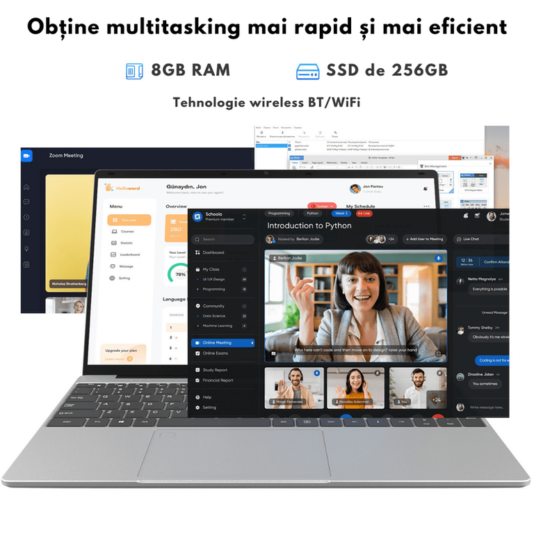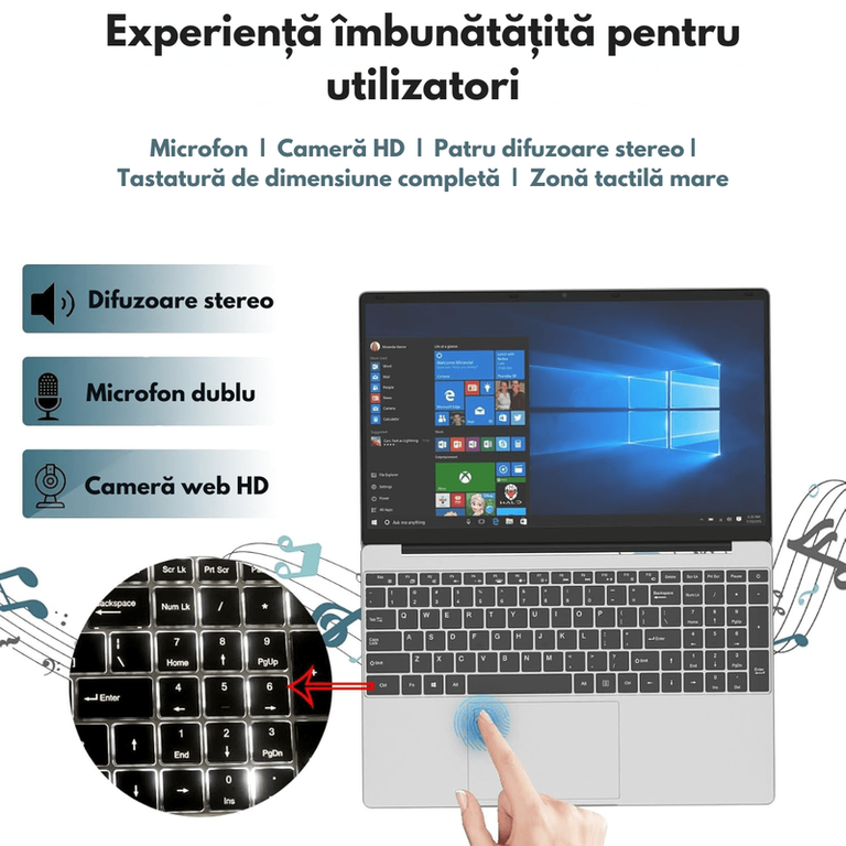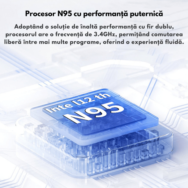 /n? Performanta exceptionala cu procesor Intel N95 (12th Gen)/nLaptopul ultraportabil de 15.6 inch este echipat cu procesor Intel Alder Lake N95, parte din generatia a 12-a, avand o frecventa turbo de pana la 3.4GHz. Cu tehnologie dual-thread si eficienta energetica superioara, acest laptop asigura viteza mare de procesare si multitasking fluid, fiind ideal pentru birou, studii, streaming si aplicatii de productivitate./n/n/n? Ecran IPS Full HD de 15.6” – Claritate si culori vibrante/nBucura-te de imagini detaliate pe ecranul IPS Full HD de 15.6", cu rezolutie 1920x1080 si raport de aspect 16:9. Tehnologia Bright View ofera culori intense si un contrast ridicat, fiind ideal pentru vizionarea de filme, editare foto-video si lucru indelungat. Designul cu margini subtiri (bezel subtire) si raport ecran-corp de 93% ofera o experienta vizuala extinsa./n/n/n? 8GB RAM si 256GB SSD – Performanta rapida si spatiu generos/nLaptopul vine echipat cu 8GB RAM DDR4, asigurand viteza mare de operare, ideala pentru multitasking fara lag. Stocarea SSD de 256GB ofera timp de pornire rapid, deschidere instantanee a aplicatiilor si transfer de date ultrarapid. In plus, spatiul de stocare poate fi extins pana la 2TB cu un SSD suplimentar./n/n/n? Baterie de mare capacitate 10000mAh – Autonomie extinsa/nLaptopul este dotat cu o baterie de 10000mAh, care asigura pana la 8 ore de utilizare continua. Fie ca lucrezi, studiezi sau vizionezi continut multimedia, autonomia generoasa iti permite sa te bucuri de mobilitate si eficienta fara intreruperi. Tehnologia de incarcare rapida de 35W reduce timpul de asteptare, astfel incat sa revii rapid la activitatile tale./n/n/n? Sunet imersiv cu 4 difuzoare stereo/nLaptopul este echipat cu 4 difuzoare stereo puternice, care ofera un sunet clar si echilibrat. Fie ca asculti muzica, vizionezi filme sau participi la conferinte video, vei avea o experienta audio de inalta calitate./n/n/n? Conectivitate avansata – WiFi & Bluetooth 5.2/n/nWiFi dual-band (2.4G & 5G) – Conexiune rapida si stabila pentru navigare fara intreruperi si streaming HD./nBluetooth 5.2 – Transfer rapid de date si conectare instantanee cu casti wireless, boxe, mouse si alte accesorii./n/n/n? Camera HD si microfon dublu pentru apeluri video clare/nLaptopul dispune de camera web HD si microfon dual integrat, ideal pentru videoconferinte pe Zoom, Google Meet, Skype si apeluri online. Reda imagini clare si sunet natural, oferindu-ti o experienta de comunicare fara zgomote de fundal./n/n? Securitate avansata cu cititor de amprenta/nProtejeaza-ti datele si acceseaza rapid laptopul cu cititorul de amprenta integrat. Autentificarea biometrica ofera securitate sporita si elimina necesitatea parolelor./n/n? Deschidere 180° si tastatura full-size iluminata/n/nDesign flexibil cu deschidere la 180°, perfect pentru diverse unghiuri de vizualizare si prezentari./nTastatura full-size, oferind o experienta de tastare confortabila si precisa, ideala pentru scris indelungat./n/n/n/n? Porturi multiple pentru conectivitate extinsa/nLaptopul dispune de multiple optiuni de conectare: ✔ 2x USB 3.0 – Transfer rapid de date✔ Mini HDMI – Conectare usoara la monitoare externe sau televizoare✔ Slot MicroSD – Extindere rapida a spatiului de stocare✔ Port jack 3.5mm – Compatibil cu casti si boxe✔ Port DC pentru incarcare rapida/n/n/n? Continutul pachetului/n✔ Laptop 15.6” IPS FHD✔ Incarcator rapid 35W✔ Manual de utilizare/n/n/n✅ De ce sa alegi acest laptop?/n✔ Procesor Intel N95 de ultima generatie, pana la 3.4GHz✔ Ecran IPS Full HD cu culori vibrante si detalii precise✔ 8GB RAM si 256GB SSD pentru performanta rapida✔ Autonomie extinsa cu baterie de 10000mAh✔ Conectivitate WiFi 5G, Bluetooth 5.2 si multiple porturi utile✔ Tastatura full-size si cititor de amprenta pentru securitate✔ Sunet puternic cu 4 difuzoare stereo✔ Perfect pentru munca, scoala, editare foto-video, gaming casual si filme/n? Alege performanta si productivitatea! Comanda acum acest laptop si bucura-te de o experienta rapida si eficienta! ??