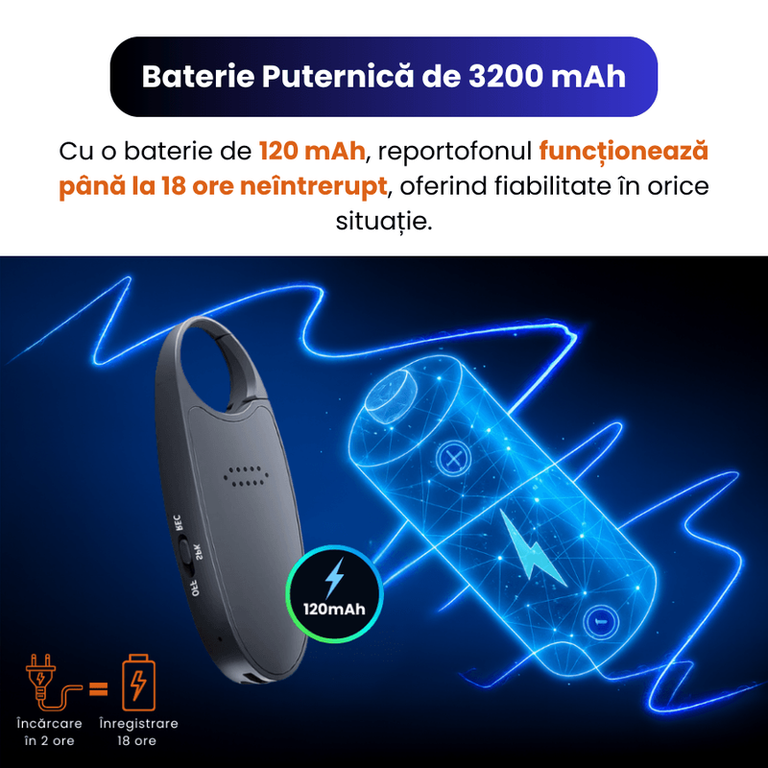 Reportofonul Profesional Z16 este un dispozitiv compact si discret, creat pentru utilizatori care au nevoie de o captura audio clara si sigura in orice situatie. Echipat cu inregistrare audio HD, activare vocala inteligenta si un magnet puternic pentru fixare, Z16 ofera o experienta completa si usor de utilizat, indiferent de mediul in care este folosit. Modelul este disponibil in doua variante de memorie: 16GB – pana la 192 ore de inregistrare si 32GB – pana la 384 ore, oferind autonomie extinsa pentru intalniri, cursuri, interviuri sau notite personale. Designul sau modern, de tip breloc, il face extrem de discret, portabil si perfect integrat in utilizarea de zi cu zi. Functia de activare vocala permite pornirea automata a inregistrarii doar atunci cand este detectat sunet, optimizand spatiul de stocare si consumul de energie. Tehnologia avansata de procesare asigura sunet curat, bine definit, chiar si in medii cu zgomot de fond. Un avantaj major al modelului Z16 este compatibilitatea excelenta: pe langa PC si Mac, dispozitivul ofera conectivitate OTG, fiind compatibil atat cu Android, cat si cu iOS (prin adaptor OTG dedicat), pentru a permite acces rapid la fisiere direct de pe telefon. Prin combinatia dintre dimensiunea redusa, performanta ridicata si usurinta in utilizare, Z16 este solutia ideala pentru cei care cauta un reportofon portabil, fiabil si discret. Magnet Integrat – Fixare Rapida pe Orice Suprafata Metalica Z16 este echipat cu un magnet puternic integrat, care iti permite sa atasezi reportofonul cu usurinta pe aproape orice suprafata metalica. Aceasta functie iti ofera flexibilitate maxima in utilizare, permitand pozitionarea discreta a dispozitivului in locuri precum mobilier, masina, suporturi metalice, electrocasnice sau elemente structurale. Magnetul asigura o fixare stabila, transformand Z16 intr-un reportofon extrem de versatil, ideal pentru situatiile in care ai nevoie de o amplasare rapida si sigura, fara a fi nevoie de suporturi suplimentare. Activare Vocala Reglabila – Inregistrare Inteligenta, doar cand este Sunet Reportofonul Z16 este echipat cu o functie avansata de activare vocala (VOX), care porneste automat inregistrarea atunci cand detecteaza sunete peste un anumit nivel. Aceasta tehnologie permite economisirea memoriei si a bateriei, captand doar momentele relevante, fara spatii inutile de liniste. Sistemul include 7 niveluri de sensibilitate (de la 10+ dB pana la 70+ dB), oferindu-ti libertatea de a ajusta declansarea inregistrarii in functie de mediul in care il folosesti — de la camere linistite la spatii aglomerate. Reglarea sensibilitatii face Z16 potrivit atat pentru inregistrari discrete, cat si pentru situatii in care vrei sa surprinzi doar vocile clare dintr-o conversatie. Datorita acestei functii, reportofonul devine un instrument extrem de eficient pentru intalniri, cursuri, interviuri sau notite vocale, transformand procesul de inregistrare intr-unul automat si fara griji. Reducere Zgomot cu Tehnologie AI – Sunet Clar, Fara Interferente Reportofonul Z16 este echipat cu un sistem inteligent de anulare a zgomotului de fundal bazat pe tehnologie AI, care filtreaza automat sunetele nedorite si pune in valoare vocea. Procesorul dedicat AI analizeaza in timp real frecventele inregistrate si elimina zgomotele constante precum fosnete, murmur ambiental, trafic sau vibratii, oferind o calitate sonora impecabila. Aceasta functie avansata transforma Z16 intr-un reportofon ideal pentru medii dificile: birouri aglomerate, spatii publice, strada, masina sau incaperi cu ecou. Rezultatul este o inregistrare clara, curata si profesionista, chiar si atunci cand conditiile nu sunt perfecte. Combinata cu activarea vocala si microfonul sensibil, tehnologia AI asigura capturi audio de inalta precizie, potrivite pentru interviuri, intalniri importante, cursuri sau note personale. Autonomie Puternica – Pana la 18 Ore de Inregistrare Z16 este echipat cu o baterie de 120 mAh, optimizata pentru consum redus, care asigura pana la 18 ore de functionare continua. Se incarca complet in aproximativ 2 ore, astfel incat il poti folosi rapid din nou. Autonomia stabila il face potrivit pentru zile intregi de inregistrari, intalniri sau sesiuni prelungite fara grija bateriei Difuzor HD Integrat & Functie MP3 Player – Redare Instanta a Inregistrarilor Reportofonul Z16 este echipat cu un difuzor HD integrat, special conceput pentru redarea clara si rapida a fisierelor audio. Acest lucru iti permite sa asculti inregistrarile imediat, direct de pe dispozitiv, fara a conecta casti sau alte accesorii. Functia este extrem de utila atunci cand ai nevoie sa verifici pe loc o discutie, un detaliu important dintr-o intalnire sau o notita vocala. Pe langa redare, Z16 functioneaza si ca un MP3 player portabil, astfel incat poti incarca si asculta fisiere audio sau muzica direct de pe reportofon. Difuzorul optimizeaza automat volumul si claritatea, oferind o experienta sonora surprinzator de buna pentru dimensiunile compacte ale dispozitivului. Prin combinatia dintre difuzorul HD, stocarea interna de 16GB/32GB si suportul pentru multiple formate audio, Z16 devine mai mult decat un simplu reportofon – este un mini dispozitiv multimedia, perfect pentru redare instanta, verificari rapide si ascultare in deplasari. Pentru utilizatorii care au nevoie de un reportofon performant, versatil si usor de utilizat, aceasta functie adauga un nivel important de confort si eficienta Utilizare Versatila – Ideal pentru Sedinte, Cursuri, Business si Lectii Reportofonul Z16 este conceput pentru a se adapta perfect diferitelor situatii in care ai nevoie de o inregistrare audio clara si sigura. Datorita dimensiunilor reduse, designului discret si tehnologiei avansate, acest mini reportofon devine un instrument indispensabil intr-o gama larga de activitati profesionale si educationale. Sedinte & Conferinte Z16 capteaza conversatiile de la masa cu o claritate excelenta, fiind ideal pentru inta
