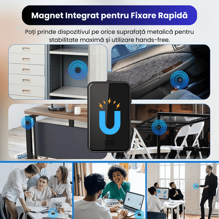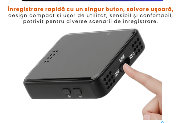 Mini Reportofon Z20 cu Microfon Ascuns si Magnet Puternic Descopera Mini Reportofonul Z20, un dispozitiv profesional pentru inregistrare audio discreta, ideal pentru sedinte, interviuri, cursuri sau notite vocale. Echipat cu microfon ascuns si activare vocala, incepe automat inregistrarea doar la detectarea sunetelor, oferind o utilizare inteligenta si eficienta. Memoria interna suporta pana la 192 ore in varianta 16GB sau pana la 384 ore pentru modelul 32GB, asigurand spatiu suficient pentru toate momentele importante. Sistemul de fixare magnetica puternica permite atasarea usoara pe orice suprafata metalica, facand dispozitivul extrem de versatil si usor de ascuns. Designul compact, portabil si fara cabluri il transforma intr-un reportofon spion performant, creat pentru cei care vor inregistrari clare si sigure, folosite intotdeauna in mod responsabil si legal. Un gadget de incredere pentru profesionisti si studenti care apreciaza calitatea audio si discretia. Reportofon Z20 – Inregistrare cu un singur click, operare rapida Reportofonul Z20 este creat pentru cei care au nevoie de inregistrare audio rapida si sigura, fara meniuri complicate. Cu functia de pornire a inregistrarii cu un singur click, dispozitivul devine extrem de usor de folosit in orice situatie: sedinte, interviuri, prezentari, lectii sau notite vocale personale. Printr-o simpla apasare spre dreapta, porneste inregistrarea, iar prin apasare spre stanga, salveaza si opreste automat fisierul, asigurand ca nu pierzi momente importante. Designul compact, portabil si confortabil permite utilizarea discreta, fiind ideal pentru profesionisti, studenti si persoane care au nevoie de organizare eficienta a informatiilor. Butoanele sensibile ofera control instant si o experienta fara batai de cap. Inregistrare audio clara si utilizare intuitiva – exact ceea ce iti trebuie pentru un dispozitiv de incredere, folosit intotdeauna in mod legal si responsabil. Reportofon Z20 cu Magnet Integrat pentru Fixare Rapida si Discreta Reportofonul Z20 este echipat cu un magnet integrat puternic ce permite fixare rapida pe orice suprafata metalica, oferind o utilizare practica si complet hands-free. Ideal pentru birouri, sali de conferinte, mobilier metalic sau chiar interiorul masinii, dispozitivul ramane stabil si perfect pozitionat pentru inregistrari audio discrete si clare. Datorita designului compact si versatilitatii sale, poate fi folosit in numeroase scenarii: intalniri profesionale, discutii de echipa, cursuri sau consultari rapide. Fixarea magnetica ajuta la ascunderea facila a dispozitivului atunci cand ai nevoie de un reportofon invizibil, fara cabluri sau suporturi suplimentare. In combinatie cu functiile inteligente de inregistrare, devine un instrument esential pentru organizarea si pastrarea informatiilor importante, utilizat intotdeauna in mod legal si responsabil. Daca ai nevoie de un gadget discret si eficient, Z20 iti ofera libertate si siguranta in orice mediu. Reportofon Z20 – Baterie 300mAh, Autonomie pana la 60 ore Reportofonul Z20 este echipat cu o baterie puternica de 300 mAh, oferind o autonomie impresionanta de pana la 60 de ore de inregistrare continua, astfel incat sa poti surprinde fiecare detaliu fara intreruperi. Cu o incarcare completa in doar 2 ore, dispozitivul este mereu gata pentru utilizare rapida in situatii profesionale, cursuri, intalniri sau calatorii. Fiabilitatea ridicata il face ideal pentru momente in care ai nevoie de inregistrare audio discreta, de lunga durata si fara griji. Designul compact combinat cu performanta bateriei iti ofera libertate totala in utilizare, fara cabluri sau alimentare constanta. Indiferent daca il fixezi magnetic pe o suprafata sau il porti cu tine, Z20 devine un instrument esential pentru organizarea informatiilor, utilizat responsabil si legal. Autonomie extinsa, claritate audio si eficienta maxima – toate intr-un reportofon mini, creat pentru profesionisti si studenti care apreciaza performanta adevarata. Reportofon Z20 – Activare Vocala Inteligenta, inregistrare automata Reportofonul Z20 include o functie avansata de inregistrare activata vocal, ideala pentru situatiile in care ai nevoie de captarea doar a momentelor importante. Dispozitivul porneste automat inregistrarea cand detecteaza voce si se opreste atunci cand nu mai exista sunet, economisind astfel spatiu de stocare si energie. Sensibilitatea poate fi ajustata pe 7 niveluri, de la 15 dB pana la 55 dB, pentru a se adapta atat mediilor linistite, cat si conversatiilor animate din sali de sedinta sau spatii publice. Aceasta functie il transforma intr-un instrument performant pentru intalniri profesionale, cursuri, interviuri sau notite vocale personale, fara grija inregistrarilor inutile. Cu activarea vocala inteligenta si designul compact, reportofonul Z20 asigura claritate audio, discretie si o experienta de utilizare moderna si eficienta, intotdeauna folosita in mod responsabil si legal. O solutie sigura pentru cei care vor rezultate precise, fara efort suplimentar. Reportofon Z20 – Difuzor HD Integrat pentru redare audio clara Reportofonul Z20 este dotat cu un difuzor HD incorporat, care iti permite sa asculti inregistrarile direct de pe dispozitiv, fara sa mai ai nevoie de casti sau boxe suplimentare. Aceasta functie aduce un plus de versatilitate, fiind ideala pentru redarea rapida a discutiilor din sedinte, verificarea notitelor vocale sau ascultarea unor fisiere audio in mod confortabil. Calitatea ridicata a difuzorului asigura o redare clara, usor de inteles chiar si atunci cand esti in miscare sau intr-un mediu dinamic. Combinand conceptul compact al dispozitivului cu aceasta functionalitate integrata, Z20 devine un instrument complet pentru organizarea eficienta a informatiilor. Este alegerea potrivita pentru profesionisti, studenti si orice persoana care doreste acces imediat la inregistrari, intr-un mod rapid, discret si practic, intotdeauna folosit in context legal si responsabil. Mai mu