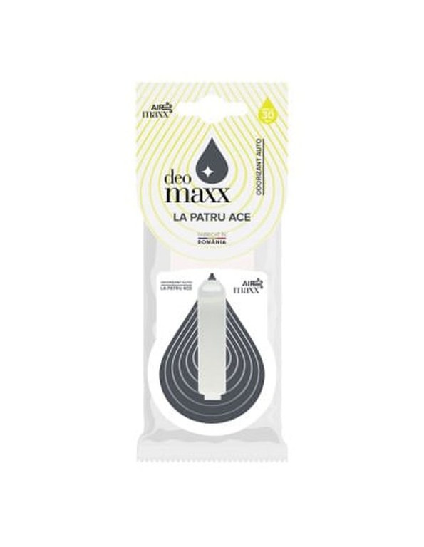 Odorizant Auto AirMaxx DeoMaxx – La Patru Ace, Parfum Lichid Elegant si Sofisticat/nExperimenteaza rafinamentul absolut cu Odorizantul Auto AirMaxx DeoMaxx – La Patru Ace, un parfum sofisticat creat pentru cei care apreciaza stilul impecabil si eleganta atemporala. Aroma sa intensa si echilibrata confera un aer proaspat si distins interiorului masinii tale, eliminand mirosurile neplacute si oferind o senzatie de curatenie si profesionalism./nCaracteristici principale:/n/nParfum rafinat si sofisticat – Note elegante, perfecte pentru un ambient premium si stilat./nNeutralizare eficienta a mirosurilor – Elimina mirosurile neplacute si mentine un aer proaspat si curat./nFormula lichida cu eliberare treptata – Difuzie constanta a parfumului pentru o persistenta indelungata./nAmbalaj premium cu bariera de protectie – Sigilat special pentru a mentine intensitatea parfumului pana la utilizare./nUtilizare versatila – Potrivit pentru masina, acasa sau birou, oferind un miros placut in orice spatiu./nDimensiuni compacte: 10 x 7 cm, usor de plasat oriunde./n/nAlege Odorizantul Auto AirMaxx DeoMaxx – La Patru Ace si bucura-te de un parfum elegant si persistent, perfect pentru cei care vor sa impresioneze la fiecare drum!