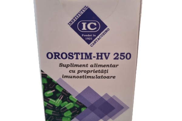 Descrierea produsuluiOROSTIM-HV 250 supliment alimentar este o combinatie intre pulberea de extract de orz verde si un lizat bacterian original, cu formula proprie, pentru utilizare orala.Pulberea de orz verde este una dintre cele mai bogate surse de hrana verde, continand importante resurse nutritive necesare celulei umane – proteine, celuloza, vitamine din grupul A, B, C, E, K, micro- si oligoelemente (Ca, Mg, Cu, Zn, Mn, K, Fe), clorofila, enzime de tip SOD-superoxid dismutaza.2. Ingrediente capsula: agenti de incarcare: celuloza microcristalina, lactoza monohidrat, amidon, fosfat acid de sodiu; pulbere de Orz verde (Hordeum vulgare) – 100 mg, lizat bacterian atomizat; capsula: gelatina.3. Mod de prezentareOROSTIM-HV 250 supliment alimentar este ambalat in flacoane de polietilena cu capac inchis cu inel de siguranta, prevazut cu silicagel si spirala de tip compensator, continand 30 capsule tari din gelatina cu cap negru transparent si corp verde opac; fiecare capsula contine 250 mg pulbere verde, fina, omogena, usor higroscopica.Cantitatea neta: 9,42 g.4. Beneficiile asociate consumului de OROSTIM-HV 250 supliment alimentarDatorita continutului de ingrediente active (orzul verde este cunoscut ca sursa naturala de vitamine si minerale), OROSTIM-HV 250 este util ca supliment alimentar, fiind un tonic general al organismului, care protejeaza celulele corpului de degradare oxidativa si are rol benefic asupra capacitatii naturale de aparare a organismului, pe care o sustine. Nu interactioneaza cu medicamentele.5. Mod de utilizareAdulti si copii de peste 7 ani: 1 capsula pe zi, cu ½ ora inainte de masa, 10 zile/luna, 3 luni consecutiv.Femei insarcinate sau care alapteaza: numai la recomandarea medicului curant.Se recomanda consumul de OROSTIM-HV 250 de catre persoanele care isi desfasoara activitatea in colectivitati, in special in perioada sezonului rece.La copii, continutul capsulelor poate fi introdus in lichide.6. Efecte secundare / Reactii adverseIn timpul utilizarii conform indicatiilor, nu s-au semnalat efecte secundare sau reactii adverse.7. Conditii de pastrare OROSTIM-HV 250 supliment alimentar se pastreaza la temperaturi sub 25℃, in ambalajul original.A se consuma inainte de sfarsitul datei de expirare, inscrisa pe ambalaj. 8.Atentionari:Acest produs este un supliment alimentar si nu are ca scop diagnosticarea, tratarea, vindecarea sau prevenirea vreunei boli.Suplimentele alimentare nu inlocuiesc o dieta variata si echilibrata si un mod de viata sanatos.Contraindicat persoanelor cu intoleranta la lactoza sau alergice la oricare dintre ingredientele produsului.Produsul este contraindicat persoanelor cu boli autoimune, tumori maligne, tuberculoza, SIDA, sindroame de malabsorbtie, insuficienta renala, insuficienta hepatica.Nu se consuma concomitent cu corticosteroizi sau alte imunosupresoare.A nu se depasi doza recomandata pentru consumul zilnic.A nu se lasa la indemana si la vederea copiilor mici.Produs fabricat in Romania. Data valabilitatii: vezi pe ambalaj