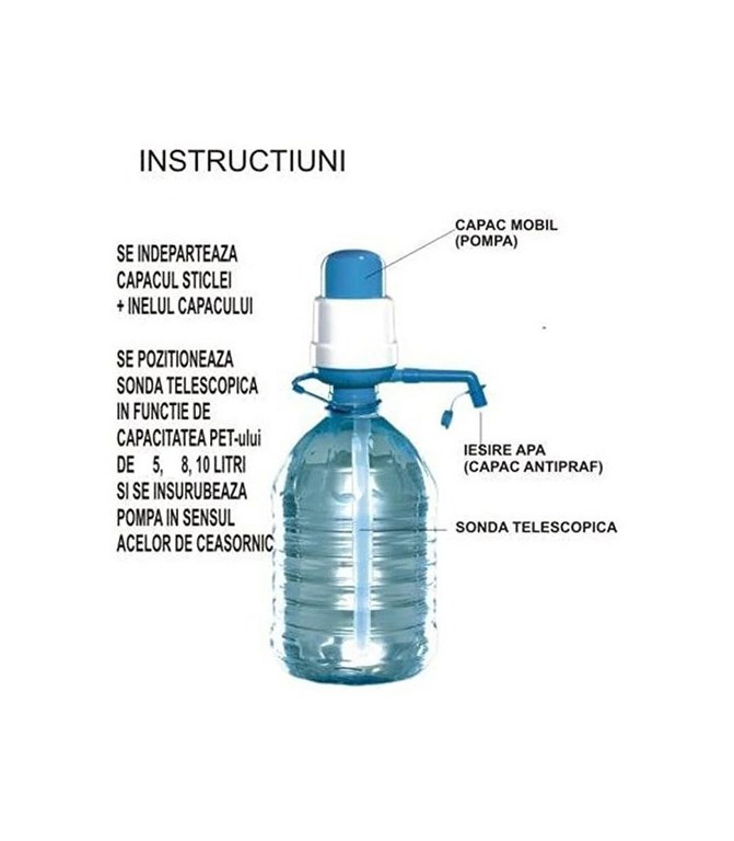 Avantaje produs:/n• Dispersor/pomopa manuala pentru bidoane apa plata de 2.5-10 L/n• Nu va trebui sa manipulati bidoanele mari cu apa/n• Pompa de apa are 3 tuburi de aspiratie interconectabile/n/nSpecficatii produs:/n/n• Fabricat din PVC/n• Pompa este potrivita pentru bidoane 2.5-10 litri/n/nContinut colet: 1 x Pompa manuala