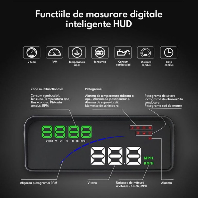 Displayul de bord pentru parbriz Head Up Display Techstar® OBD II P 9 este folosit de catre pilotii avioanelor pentru a spori atentia acestora, aceasta tehnologie a fost implementata la autoturismele de ultima generatie fiind un accesoriu util.Luminozitatea afisarii Displayului de bord pentru parbriz Head Up poate fi reglata. Acest display pentru parbriz este util in evitarea accidentelor, principala cauza a acestora fiind neatentia conducatorului sau neadaptarea vitezei la conditiile de trafic, lucru care poate fi evitat atunci cand vitezometrul este afisat pe parbriz.HUD afiseaza date de conducere pe parbrizul din fata, cum ar fi viteza, turatia, temperatura apei, tensiunea, kilometrajul unic pe geamul geamului din fata. Soferii pot citi informatiile de conducere instantaneu si le pot folosi bine pentru a evita potentiala nesiguranta la volan.Caracteristici: Disponibil pentru aproape toate masinile cu o interfata OBD2/EOBD. O tasta pentru a comuta in modul simplu, afiseaza doar viteza si RPM. Mod de reglare automata si manuala a luminozitatii, condus fara stralucire. 2 moduri de afisare, comutator liber: Cititi de pe parbriz / Cititi direct de pe unitate Functii de alarma: Memento de schimbare, alarma de viteza, memento de oboseala de conducere, alarma de joasa tensiune, alarma de temperatura ridicata, alarma de defectiune a motorului, eliminarea defectiunilor Afisare mai abundenta: Viteza vehiculului MPH/KMH, turatia motorului, temperatura apei, tensiunea bateriei, consumul instantaneu de combustibil, consumul mediu de combustibil, kilometrajul calatoriei Pornire/oprire automata: HUD pornit/oprit daca vehiculul a pornit/oprit, protectie eficienta a bateriei masinii.Specificatii: Nume produs: HUD Material: ABS+PC Dimensiuni: 118 x 45 x 43mm Greutate: 250 g Temperatura mediului: - 40℃ ~ +120℃ Presa barometrica: 86-106KPa Umiditate relativa: 10%-95% Nivel de sunet de alarma: 》=30dB (A) Tensiune de lucru: DC 9V ~ 16Vdc (12Vdc / 400mA) Curent de somn: ≤ 30mA Mod de afisare: Reflectia imaginii virtuale Ecran de afisare: Display LEDContinut pachet: 1 x Unitate HUD 1 x Cablu OBD 1 x Covoras antiderapant 1 x Film reflectorizant 1 x Manual de utilizare