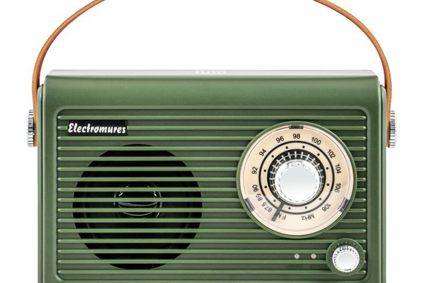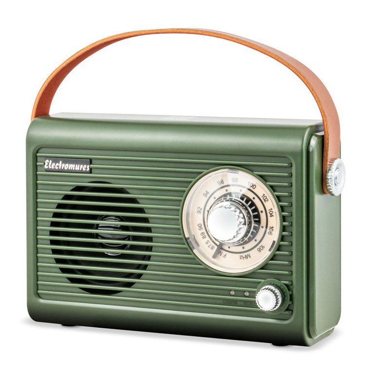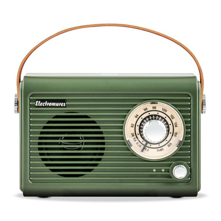 Radio retro cu difuzor Bluetooth Electromures EM 1005, 5V, Baterie incorporata 1500 mAh, Autonomie 6 h, Port USB, Port mini jack, Antena telescopica, Verde Argintiu/nBaterie incorporata (radio pana la 7 ore, difuzor Bluetooth pana la 6 ore)./nIncarcare usoara prin cablu USB-C (cablu inclus, incarcatorul nu este inclus)./nPort mini jack de 3,5 mm (AUX)./nPort USB ce permite redarea fisierelor MP3, WMA, WAV si FLAC de pe memorie USB./nRadio FM cu frecventa 87,5-108 MHz./nAntena telescopica./nVersiunea BT: 5.3 (frecventa nominala: 2,4 Ghz)./nDistanta transmisie Bluetooth: maxim 10 m./nDifuzor: 3" (7,6 cm), 5W (amplificator de 3 W)./nTensiune nominala: 5V./nBaterie: 3,7 V, 1500 mAh (tip baterie 18650)./nRaportul semnal/zgomot ≥ 65dB./nManer din piele.