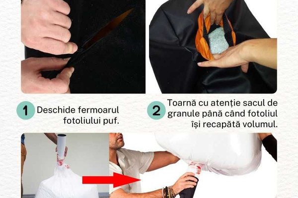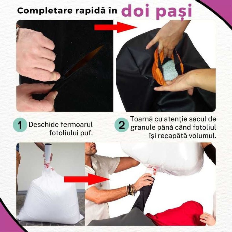 /nDupa un anumit timp, granulele din fotoliul tau se mai taseaza (depinde de cat de mult te-ai relaxat pe el :)). Deci trebuie fie sa recompletezi fie sa reumpli. Pentru a fi sigur, poti verifica inauntru si poti vedea cat de tasate sunt bilutele. /n Noi, Pufrelax, va oferim granule virgine de polistiren expandat EPS 50 - de cea mai buna calitate (la cerere punem la dispozitie certificat de origine si calitate). /n /nMare atentie, pe piata (in cazul in care doriti sa cumparati din alta parte) aveti sansa sa gasiti fie granule pentru șapa - care au un miros urat, nu sunt pretabile pentru reumplere pufi, fie granule rezultate din deseuri polistiren spart, care au mult praf in ele, lucru care este periculos pentru sanatate, si in urma carora veti avea mult timp de sters praful.. /nCantitatea de 1 Kg este de ajuns pentru: /n- umplerea de la zero a unui puf - Taburet Cilindru /n- umplerea de la zero a unui puf - Taburet Cub/XL /n- umplerea de la zero a unui puf - Sunlounger Junior /n /nNecesar pentru umplerea de la zero: /n- puf Relaxo - aprox 2 Kg /n- puf Nirvana Hobbit - aprox 2 Kg /n- puf Sunlounger- aprox 2 Kg /n- puf Sunlounger Evo - aprox 3 kg /n- puf Relaxo XL - aprox 3 Kg /n- puf Nirvana Grande - aprox 3 Kg /n- puf Magic Pillow - aprox 4 Kg /n- puf Nirvana Gigant - aprox 4 Kg /n- puf Kudos - aprox 4 Kg /n- puf Sunlounger Evo XL -aprox 4 Kg /n- puf Minge Telstar XL - aprox 4 Kg /n- puf Armadillo XL - aprox 4 Kg /n- puf Minge Telstar XXL - aprox 5 Kg /n- puf Canapea R2 - aprox 9 kg /n /n /n/n/n/n/n
