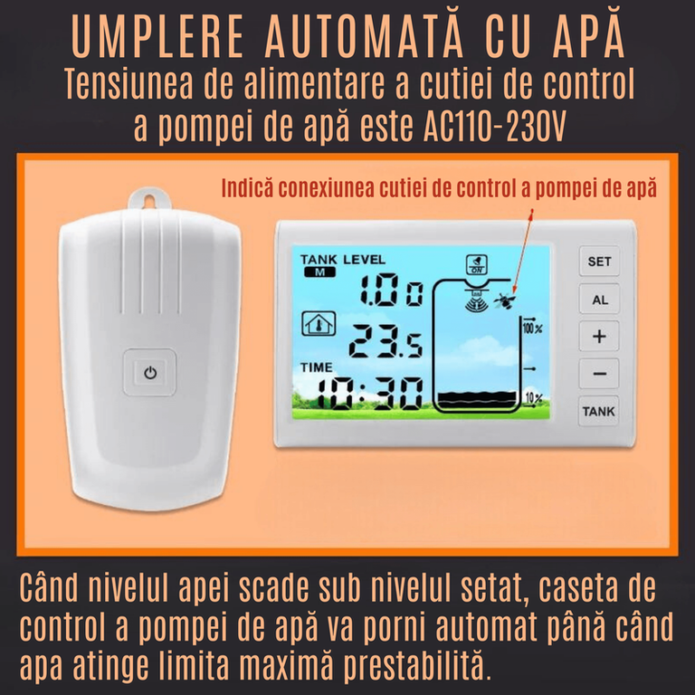 ⚜️ Senzor ultrasonic pentru masurarea nivelului de lichid din rezervor cu functie de monitorizare constanta nivel si temperatura cu umplere automata. ⚜️ Acest dispozitiv cu ultrasunete este ideal pentru monitorizarea si controlul automat al nivelului de lichid din rezervoare sau containere uniforme. Datorita tehnologiei avansate cu ultrasunete, permite masurarea precisa a nivelului apei si a temperaturii lichidului, oferind totodata functia de umplere automata la atingerea unui nivel scazut. Senzorul este prevazut cu un sistem de incarcare solara, astfel ca functionarea este eficienta si prietenoasa cu mediul. Monitorizare nivel apa: Afisare exacta a nivelului de lichid din rezervor pentru o gestionare eficienta, adancime intre 1 si 5 metri. Umplere automata: Activeaza pompa automat cand nivelul apei scade sub un anumit prag, asigurand un flux constant. Senzor de temperatura lichid: Masoara temperaturi intre -40ºC si +60ºC, oferind date exacte despre conditiile lichidului. Alarma nivel scazut lichid: Monitorizeaza nivelul de lichid din rezervor cu ajutorul senzorului ultrasonic. Puteti Seta alarme pentru niveluri specifice si astfel primiti notificari la timp pentru niveluri minime/maxime sau cand rezervorul este gol. Ceas cu alarma Alimentare solara: Senzorul este echipat cu un panou solar care incarca bateriile reincarcabile pentru o functionare neintrerupta si economica. Impermeabilitate IP65: Rezistent la intemperii, ideal pentru utilizare in aer liber. Transmisie wireless: Datele sunt transmise fara fir la receptor, cu o distanta de pana la 100 de metri in aer liber, frecventa 433 MHz. Precizie ridicata: Masoara nivelul apei cu o precizie de ±0,05 m si temperatura cu o precizie de ±1ºC. Ecran iluminat de 11 cm: Afisaj clar cu functii multiple: adancime apa, temperatura apa, temperatura interioara, ora, baterie descarcata si alarma. ⚜️ Beneficii produs: Solutie complet automatizata: Senzorul monitorizeaza constant nivelul si temperatura lichidului, activand pompa de apa automat la nevoie. Economie de energie: Sistemul cu panou solar reduce dependenta de alimentarea externa, iar bateriile reincarcabile incluse asigura o durata lunga de functionare. Instalare usoara si fara griji: Impermeabil si usor de montat, senzorul este ideal pentru gestionarea rezervoarelor de apa in zone exterioare. Fiabilitate si durabilitate: Carcasa din ABS si protectia IP65 asigura o utilizare indelungata chiar si in conditii de mediu dure. Monitorizare continua si alarma: Senzorul avertizeaza in cazul unui nivel scazut de apa si permite umplerea automata, evitand posibile defectiuni sau intreruperi ale fluxului de apa. ⚜️ Specificatii tehnice: Dimensiuni Receptor: 135*26*84 mm, Greutate: 184 g Dimensiuni Transmitator: 68*106*167 mm, Greutate: 216 g Dimensiuni Cutie Control Pompa de Apa: 70*35*130 mm, Greutate: 133 g Interval de masurare a temperaturii lichidului: -40ºC pana la +60 ºC Precizie masurari nivel apa: ±0,05 m Distanta transmisie: 100 metri in aer liber Impermeabilitate Transmitator: IP65 Alimentare: Panou solar si 6 baterii AAA 1.2V Ni-MH (neincluse) ⚜️ Pachetul include: 1 x Receptor 1 x Transmitator 1 x Cutie de comanda pompa de apa 1 x Cablu de alimentare TYPE-C 3 x Suruburi de montare 1 x Manual de instructiuni in limba romana si engleza ⚜️ Ideal pentru rezervoare de apa pentru irigatii, apa potabila, apa pentru animale, apa pentru campinguri si rulote, rezervoare de ulei, pentru butoaiele cu vin, gospodarii si afaceri care necesita un control precis si automatizat al nivelului de apa din rezervoare!
