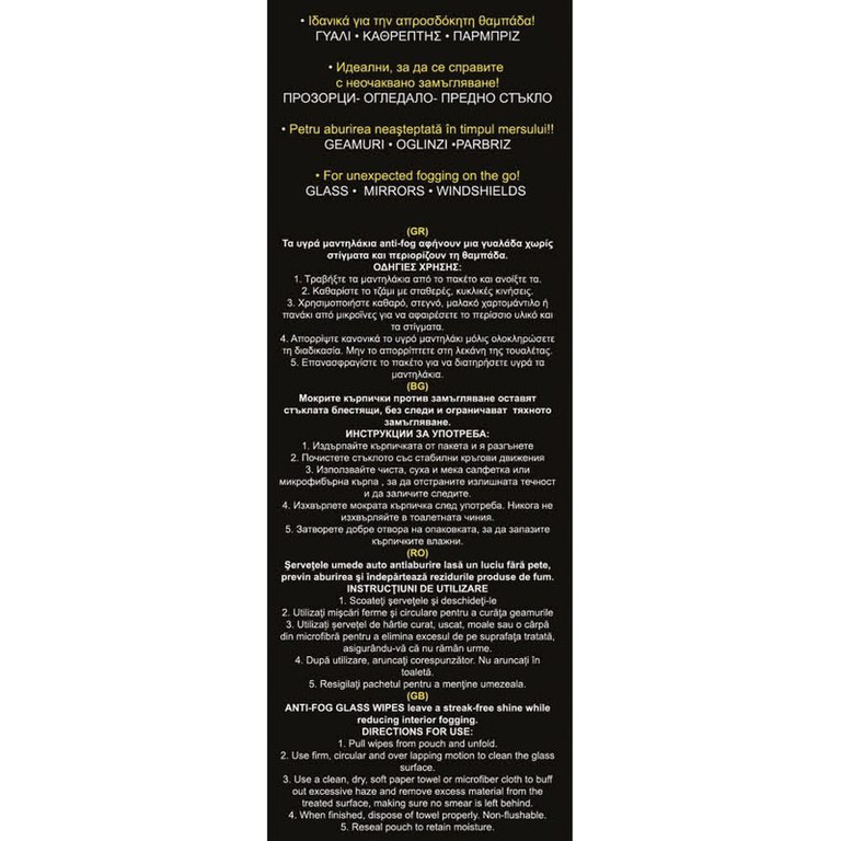 Stergeti Estomparea cu Usurinta si Eficienta!Transformati experienta condusului cu Servetelele Umede Anti-Estompare, special concepute pentru a mentine suprafetele din sticla, oglinda si parbriz perfect clare.Reduc Estomparea: Indiferent de vreme, servetelele noastre previn aburirea, asigurand vizibilitate maxima in orice moment.Dimensiuni Practice: Cu o marime de 15x20 cm, acestea sunt usor de utilizat, oferind acoperirea optima pentru curatare eficienta.Pentru Masina Ta: Ideal pentru soferii ce doresc sa pastreze un aspect impecabil al geamurilor si oglinzilor auto.Avertismente:A nu se lasa la indemana copiilor.Experienta condusului devine mai sigura si mai placuta cu Servetelele Umede Anti-Estompare, partenerul tau de incredere pentru o vizibilitate clara si netulburata. Beneficiaza de calitatea deosebita a acestor servetele si pastreaza-ti masina in cea mai buna forma!