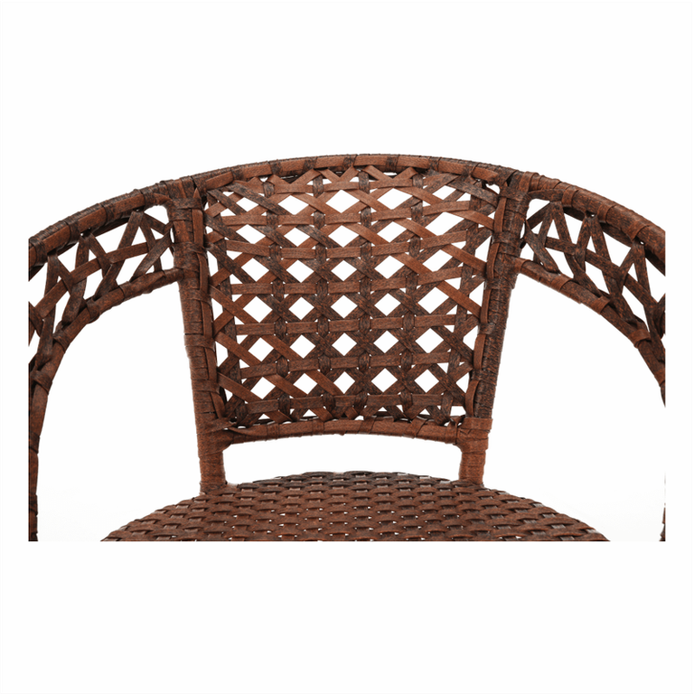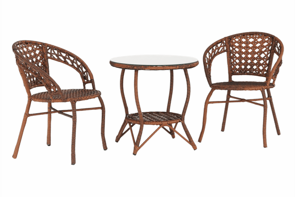 Material: ratan artificial/otel/sticla securizataCuloare: maroMasa (LxGxI): 60x60x52 cmScaun (LxGxI): 58x59x74 cmAdancimea sezutului: 45,5 cmInaltimea sezutului: 41cmGreutate scaun: 90 kgSet din 3 pieseO masaDoua scauneScaunul stivuibil