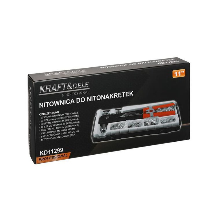 Presa manuala pentru nituri filetate Kraft&Dele KD11299 – cu accesorii complete/nDescopera presa manuala pentru nituri filetate KD11299 de la Kraft&Dele – o unealta robusta, perfecta pentru ateliere, garaje sau santiere. Acest dispozitiv permite fixarea usoara si precisa a niturilor filetate in tabla sau profile metalice, fara a fi necesara filetarea. Setul complet include capete si tije pentru cele mai uzuale dimensiuni, precum si un pachet generos de nituri filetate din aluminiu, gata de utilizare imediata./n/n⚙️ Specificatii tehnice:/n/n/nModel: KD11299/n/n/nTip: Presa manuala pentru nituri filetate/n/n/nInterval de lucru: M3, M4, M5, M6, M8/n/n/nMaterial: Otel calit, rezistent la uzura si deformari/n/n/nCompatibilitate: Aluminiu, otel, inox (in functie de tipul de nituire utilizat)/n/n/n/n? Avantaje structurale:/n/n/n? Capete si tije interschimbabile – acopera cele mai frecvente dimensiuni M3–M8/n/n/n✋ Manere ergonomice cu prindere anti-alunecare – confort in utilizare indelungata/n/n/n?️ Constructie durabila – fabricata din otel calit pentru o rezistenta ridicata/n/n/n? Trusa organizata – valiza rigida pentru transport si depozitare eficienta/n/n/n✅ Ideal pentru utilizatori profesionisti sau amatori/n/n/n/n? Continutul pachetului:/n/n/n1 x Presa manuala pentru nituri filetate KD11299/n/n/n20 x nituri filetate M3 din aluminiu/n/n/n20 x nituri filetate M4/n/n/n20 x nituri filetate M5/n/n/n20 x nituri filetate M6/n/n/n20 x nituri filetate M8/n/n/n5 x tije interschimbabile (pentru M3–M8)/n/n/n5 x capete corespunzatoare/n/n/n1 x valiza de transport/n/n/n1 x manual de utilizare/n/n/n1 x certificat de garantie (12 luni)/n/n/n/n? De ce sa alegi acest produs?/nDaca ai nevoie de o solutie rapida, precisa si durabila pentru fixarea niturilor filetate, KD11299 este alegerea potrivita. Este o unealta usor de folosit, fiabila si perfecta pentru lucrari in metal, caroserii, instalatii sau confectii tehnice./n? Comanda acum si imbunatateste-ti trusa de scule cu o presa profesionala completa!