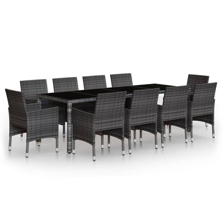 Bucurati-va de o masa buna sau de un ceai de dupa-amiaza in spatiul din aer liber, cu acest set de mobilier de gradina! Avand un design elegant, va deveni punctul central al gradinii si al curtii dvs! Material premium: Datorita cadrului robust din otel, invelit cu ratan PE tesut manual, rezistent la intemperii, acest set de terasa in aer liber este rezistent la rugina si mucegai, ceea ce poate oferi ani de relaxare de calitate.Cadru robust si stabil: Cadrele din otel asigura robustete si stabilitate.Scaune confortabile: Proiectat cu spatar si cotiere curbate, scaunul de gradina are o forma mai ergonomica, pentru un confort maxim. Pernele sunt incluse pentru un suport suplimentar, iar husa cu fermoar este detasabila, pentru o spalare usoara. Nota:Pentru a prelungi durata de viata a mobilierului dvs. de exterior, va recomandam sa il protejati cu o husa impermeabila.MasaCuloare: NegruMaterial: Otel vopsit electrostatic, sticla securizata, poliratanDimensiuni: 200 x 150 x 75 cm (L x l x i)Grosime sticla: 5 mmScaun:Culoare scaun: NegruCuloare perna: Alb cremMaterial scaun: Poliratan, otelDimensiuni scaun: 52 x 57 x 84 cm (l x ad. x i)Latime sezut: 39/44,5 cmAdancime sezut: 46 cmInaltime brat fata de sol: 62/65 cmDimensiuni spatar: 38/45 x 53 cm (l x i)Grosime perna de sezut: 4 cmRezistent la intemperiiUsor de intretinutAsamblare necesara: DaPachetul de livrare contine:1 x Masa10 x Scaun10 x Perna de sezut
