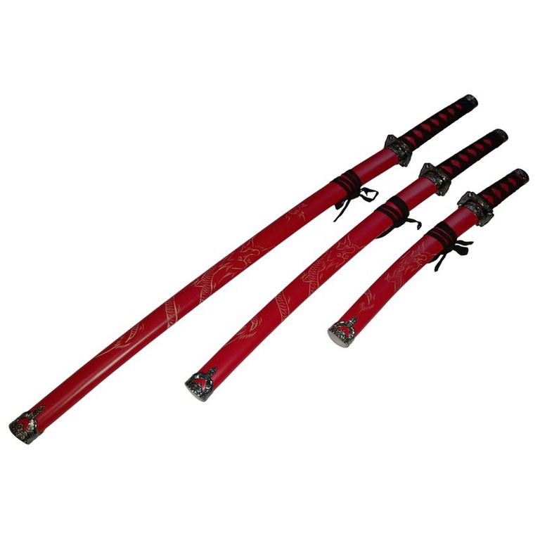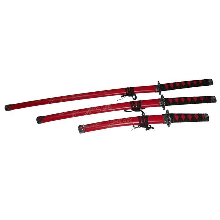 Obiect decorativ tip panoplie special destinat pentru colectionari si pasionati de arta razboinica. Sabii replici ale katanelor japoneze din secolul 12 Lungime sabii: 42.5 | 51 | 83 cm Material lama: metal Material maner: plastic si cu invelis textil Vine insotita de teaca ornamentata pentru fiecare sabie Totodata vine insotita si de un suport din lemn pentru un display unic