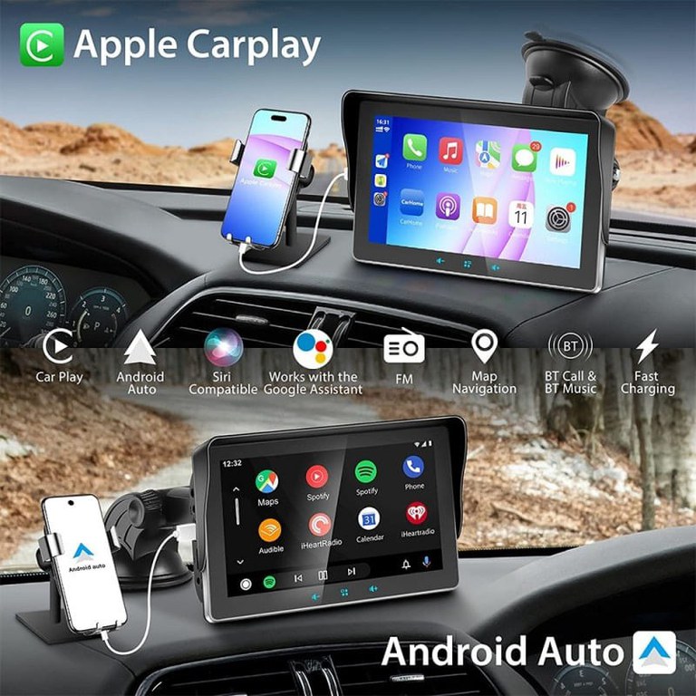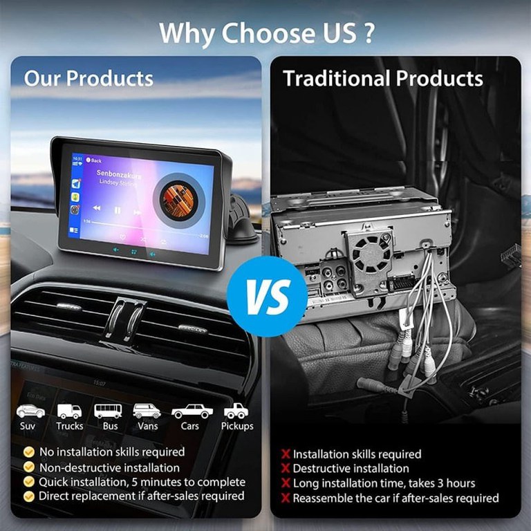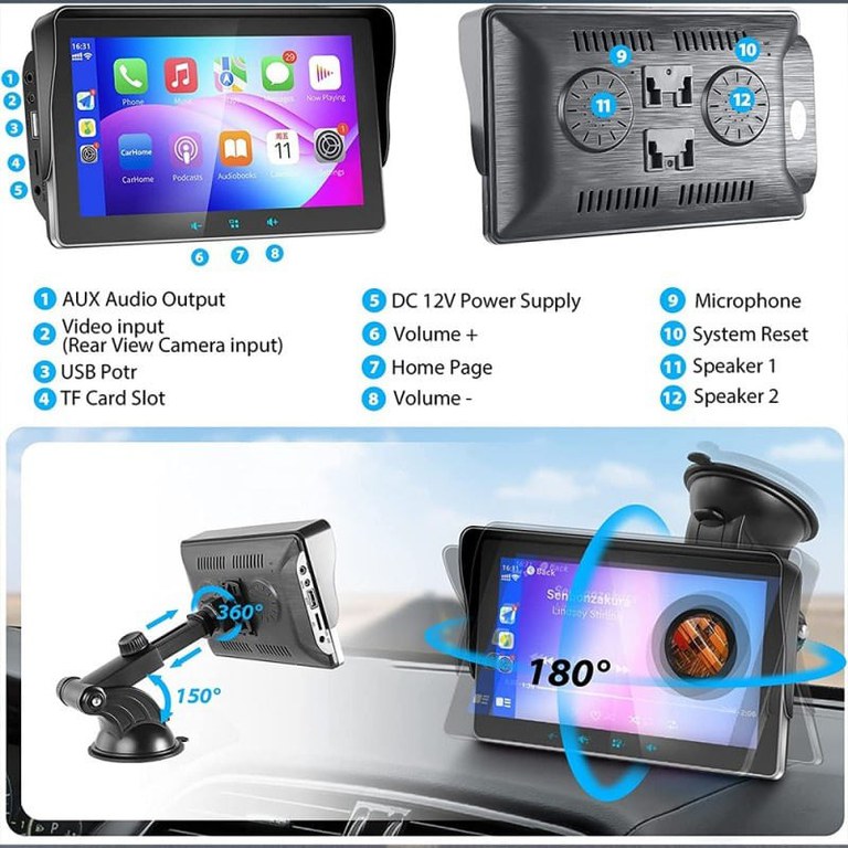 Sistemul Multimedia Techstar® Apple Carplay/Android pentru masina, vine echipat cu un ecran tactil capacitiv de inalta definitie de 7 inchi, accepta redarea video 1080. Cu cel mai recent cip inteligent, atingerea va fi mai sensibila si mai precisa, rularea va fi mai stabila si mai lina. Ecranul tactil mare clar va ofera control intuitiv asupra muzicii si functiilor smartphone-ului. Control usor si experienta vizuala minunata.Wirelsee Apple Carplay/Android Auto: Acest stereo auto accepta wireless Apple Carplay/Android Auto. Doar conectati-va cu smartphone-ul prin bluetooth. Puteti gestiona fara fir navigarea, mesageria, apelurile telefonice, muzica, e-mailul, notificarile si multe altele. Puteti chiar sa conectati asistentul Google sau Siri al dispozitivului dvs. pentru a controla apelurile telefonice, a naviga, a reda muzica, totul astfel incat sa va puteti concentra pe drum, sa va pastrati mainile libere si sa conduceti in deplina siguranta!Bluetooth 5.0 face conducerea mai sigura: Cipul Bluetooth 5.0 cu specificatii superioare incorporat face semnalul Bluetooth mai stabil. Sistemul hands-free Bluetooth si microfonul clar incorporat va permit sa efectuati apeluri fara maini fara probleme, redarea muzicii si controlul vocal, facand calatoria si conducerea mai sigure si mai convenabile.Conexiune AUX: Radioul nostru auto accepta cablul AUX pentru a se conecta la intrarea audio auxiliara a masinii pentru a transmite vocea la radioul original al masinii. Puteti asculta cu precizie radio si televiziune, stiri, muzica, informatii de calatorie in orice moment si va puteti bucura de timpul de conducere.Alte functii: 7 inch 1080P Full HD Touch Screen Radio Auto MP5 Player Suport USB/TF Card/AUX, Music Player, Video Player. Suporta functia de legatura oglinda, foloseste conexiunea wireless pentru a sincroniza smartphone-ul cu ecranul tactil, bucura-te de harti, filme si multe altele! Nu numai ca va puteti bucura de diverse functii, dar va puteti si incarca telefonul. Gama de tensiune este de la 9V la 26V, potrivit pentru toate modelele, inclusiv camioane, autobuze etc.Serviciul Clienti: Sistemele stereo auto sunt compatibile doar cu tensiunea DC de 12 V auto. Se recomanda sa utilizati o conexiune prin cablu la carplay atunci cand utilizati functia carplay, care poate face navigarea mai lina, mai receptiva si sa evite pierderea intersectiilor importante. Oferim servicii excelente pentru clienti si o echipa tehnica profesionista poate rezolva problemele produselor. Daca aveti intrebari, va rugam sa nu ezitati sa ne contactati si va vom ajuta sa rezolvati problema.Specificatii: Suporta conexiuni wireless si prin cablu: Android auto si Apple CarPlay (Este recomandat sa utilizati o conexiune prin cablu la carplay atunci cand utilizati functia carplay, aceasta va poate face imaginea mai fluida si mai receptiva atunci cand utilizati navigarea, puteti evita pierderea intersectiilor importante.) Suport comenzi vocale: control vocal Apple Siri si Android si Google. Redare multimedia: USB + AUX + card TF Porturi multiple de intrare Tensiune adaptiva: 9V pana la 26V Formate video acceptate: 3GP/ASF/AVI/DivX/mkv/MOV/MP4/MPG/TS/VOB/WEBM/M4V/FLV Formate audio acceptate: MP3/MP2/WAV/AAC/AMR/M4A/OGG/APE (fara pierderi)/FLAC (fara pierderi) Tip de instalare: Dezasamblare usoara, tablou de bord sau parbriz Modele de masini aplicabile: potrivite pentru toate modelele, inclusiv camioane, autobuze si asa mai departe. Produse universale indiferent de model Versiunea telefonului este actualizata in mod constant si aparatul trebuie actualizat in consecinta. Daca intampinati nereguli in timpul utilizarii, puteti solicita asistenta vanzatorului si va vom ajuta sa actualizati noua versiune.Mod de utilizare: 1. Nu va puteti conecta la Bluetooth? Va rugam sa stergeti inregistrarile bluetooth de pe telefonul mobil si pe aparat si reacordati conexiunea. Cand conectati un nou bluetooth, inregistrarea anterioara trebuie stearsa. 2. Cum se conecteaza Bluetooth-ul altor telefoane mobile? Va rugam sa stergeti inregistrarile bluetooth de pe telefonul mobil si pe aparat si reacordati conexiunea. 3. Se aude muzica si nu se aude sunetul? Va rugam sa verificati daca reda FM, doar opriti FM. 4. Ecranul nu poate fi pornit? Nu puteti incepe? Daca intampinati o situatie in care nu se porneste sau nu porneste, asigurati-va ca adaptorul este pornit. 5. Ecranul tactil nu este usor de utilizat? Daca intampinati astfel de probleme, este recomandat sa incercati functia de resetare din fabrica si sa salvati datele inainte de utilizare. 6. Decalaj navigare GPS? Este recomandat sa utilizati o conexiune prin cablu la carplay, care va permite sa utilizati navigarea mai usor si mai receptiv si sa evitati ratarea intersectiilor importante.Pachetul include: 1 x ecran de afisare 1 x Suport 1 x cadru Blackout 1 x plasture fix pentru ham 1 x cablu audio AUX 1 x cablu de alimentare 1 x Dasket fix 1 x Manual de utilizare