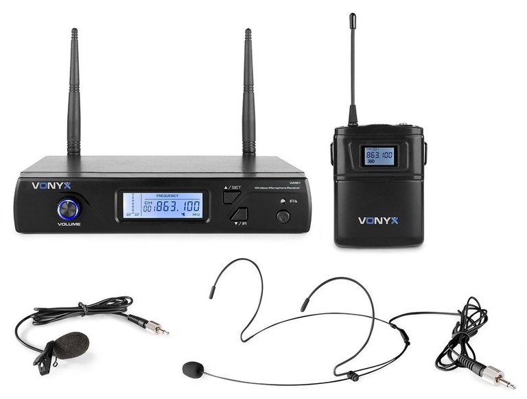 Sistem Microfon wireless headset si Lavaliera Vonyx WM61B, cu oscilator si 16 canale/nSeria de microfoane wireless Vonyx WM6 ofera o transmisie wireless clara, fata zgomot si o reproducere excelenta a sunetului. Configurarea si instalarea simpla va permit sa transmiteti sunetul clar instantaneu. Aceste Sisteme functioneaza In banda UHF de 863-865MHz si au 16 canale, prevazute cu un ecran luminos si clar. Ideale ca Microfon pentru petrecere, vorbire, karaoke, sport, Intalniri si asa mai departe./nSpecificatii Sistem wireless headset si Lavaliera Vonyx WM61B :/n/nReceptor cu bodypack si casca/nBodypack cu ecran care indica frecventa si indicatia scazuta a bateriei/n16 canale cu frecvente selectabile/nOscilator PLL/nAfisaj clar/nInvatare IR/nIesire XLR echilibrata si o iesire de un mix echilibrat de 6,3 mm/nAdaptor de retea si mufa de 6.3 mm furnizat/nConexiuni de iesire: jack de 6.3 mm, XLR (3 pini)/nInterval dinamic: >85dB/nInterval de frecventa: 863.000 - 865.000 MHz/nFrecventa Microfon portabil: Selectabil/nRaspuns la frecventa: 40 - 17000 Hz/nStabilitatea frecventei: 0.002%/nSensibilitate: -90dB/nRaport semnal-zgomot: >90dB/nTHD: <1%/nBaterii: 3V (2 x AA)/nSursa de alimentare: 100-240V AC 50/60Hz (5V Micro-USB)/nConsum de energie: 0.022 - 0.011A/nDimensiuni:/nReceptor: 185 x 215 x 40 mm/nBodypack: 30 x 68 x 100 mm/nGreutate: 0.6 kg/n