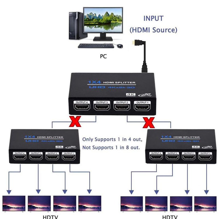 Splitter HDMI 1x4 4K cu Amplificator Staryon® 1 In 4 Out HDMI - HDMI 1.4b, Suport 3D, Alimentare 5V/2A, Negru
