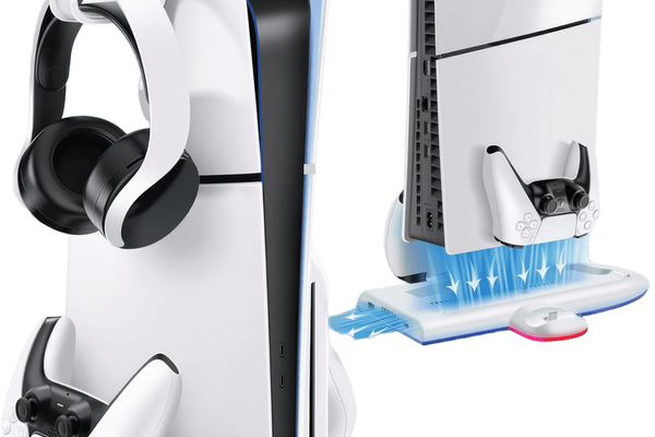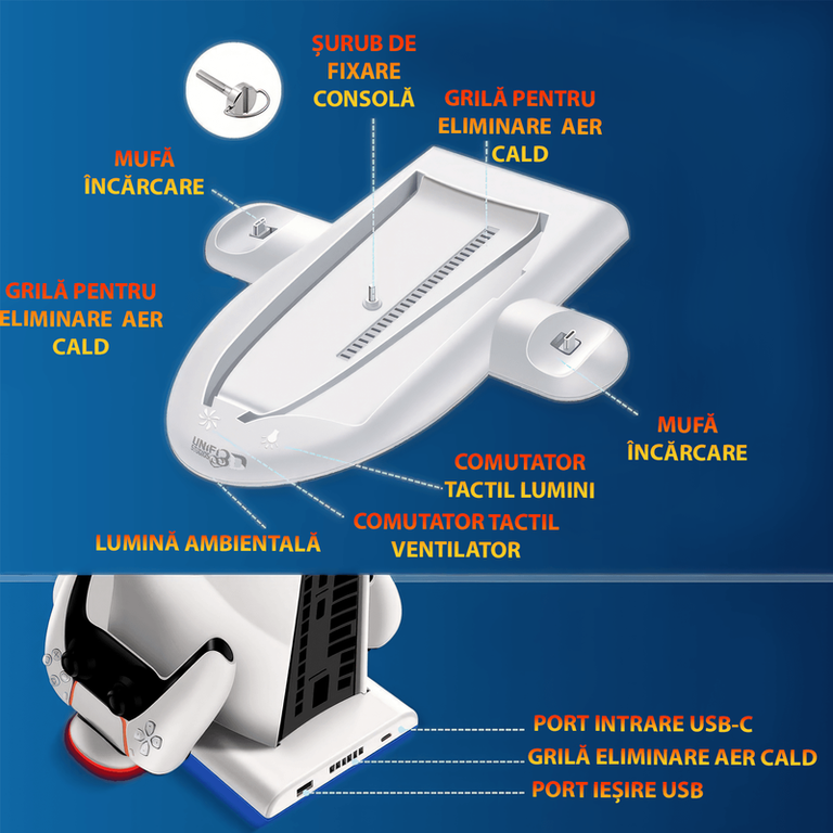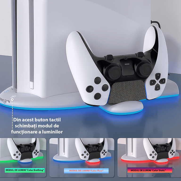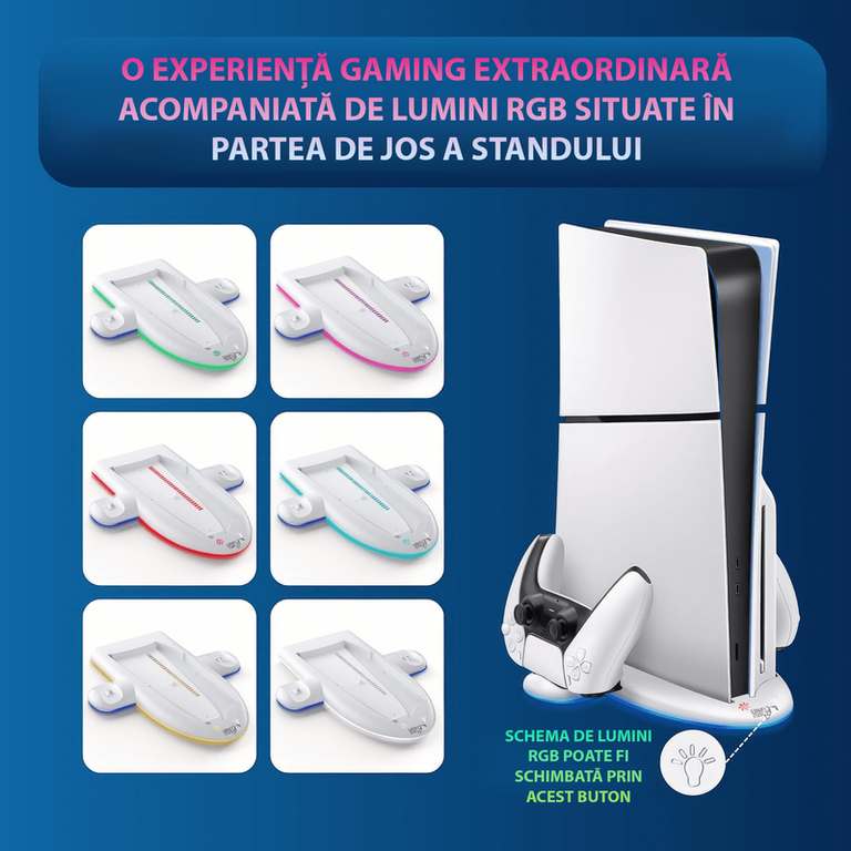 Imbunatatirea Suprema a Experientei de Gaming Transforma-ti experienta de gaming cu suportul vertical de racire pentru consola PS5 Slim, echipat cu o statie de racire si incarcare duala pentru controllerelor PS5 Slim. Tehnologie de Racire Superioara Suportul de racire pentru PS5 Slim dispune de 3 moduri de viteza pentru ventilatoare cu pana la 5500 RPM (Inalt, Mediu, Scazut ). Asigura o racire eficienta pentru consola ta, mentinand temperaturile optime in timpul sesiunilor lungi de gaming. Experienta Dinamica de Iluminare Bucura-te de 9 culori RGB cu functie de memorie pe suportul vertical de racire pentru PS5 Slim - rosu, verde, albastru, mov, cyan, galben, alb, efect rapid de flash colorat si efect lent de flash colorat. Iluminarea dinamica adauga o nota spectaculoasa la setup-ul tau de gaming. Usor de Utilizat Suportul nostru pentru consola PS5 Slim dispune de 2 comutatoare tactile pentru ajustarea vitezei ventilatoarelor si pentru schimbarea modului de iluminare RGB, avand si posibilitatea de a opri toate luminile printr-o apasare de 3 secunde. Functia de memorie a vitezei ventilatoarelor retine ultimul mod utilizat in momentul repornirii. Durabilitatea intalneste Designul Fabricat din material ABS, suportul nostru vertical de racire pentru PS5 Slim este conceput pentru o durabilitate maxima. Baza cu un cauciuc anti-alunecare mentine suportul vertical stabil si fixat in pozitie, iar portul USB 2.0 suplimentar permite transferul de date aditional. Compatibilitate extinsa Potrivit pentru utilizarea cu consola PS5 Slim, acest suport de racire si incarcare duala pentru controllerelor PS5 Slim este accesoriul ideal pentru orice gamer care isi doreste optimizarea setup-ului de gaming. Imbunatateste-ti experienta de gaming cu suportul de racire pentru PS5 Slim si bucura-te de fiecare sesiune de joc intr-un mediu optimizat si plin de culoare! Adauga un plus de performanta si stil setup-ului tau de gaming!