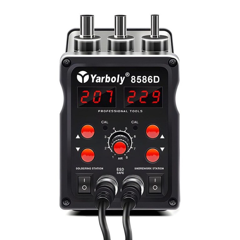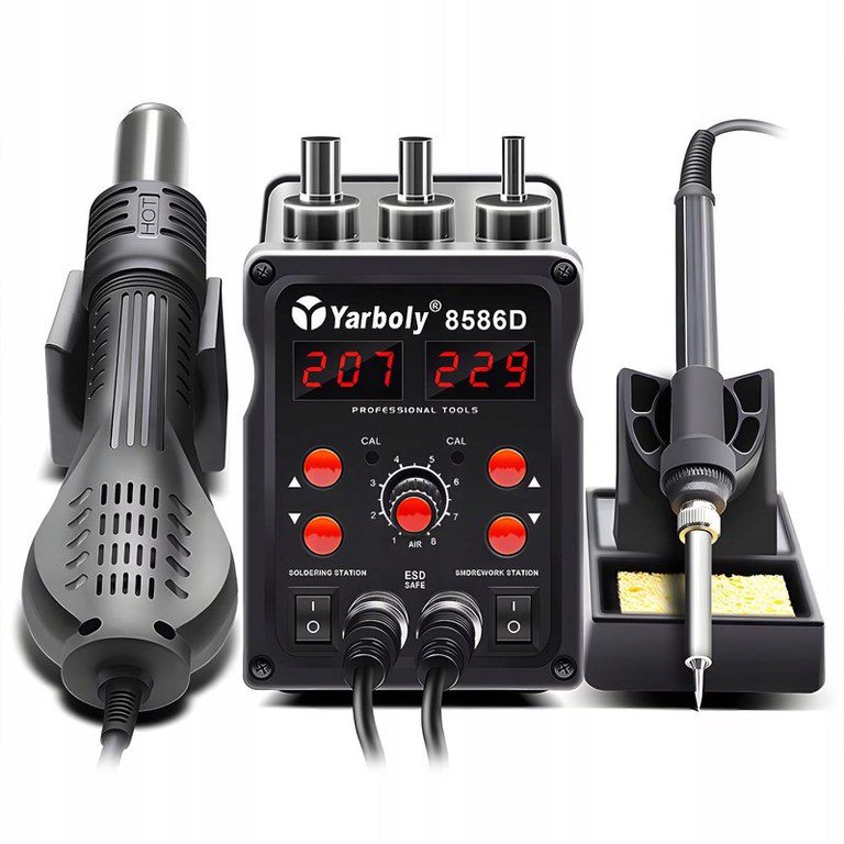 Statie de Lipit 2in1, Putere 700W + 60W, Reglare Temperatura 100°C-500°C, Ecran LCD, 3 Duze Interschimbabile de Diferite Dimensiuni, Negru/n/nUn instrument indispensabil pentru toti profesionistii si pasionatii de bricolaj. Datorita controlului precis al temperaturii (100°C - 500°C), unei suflante cu aer cald eficient si unui fier de lipit ergonomic, ofera versatilitate si fiabilitate in fiecare sarcina./nExtrem de compact, economiseste spatiu, iar electronica moderna asigura cea mai mare precizie si stabilitate a muncii./nSpecificatii tehnice/n/n Tensiune de intrare: AC 220V±10%/50Hz/n/nPistol cu aer cald/n/n Putere: 700W/n Stabilitatea temperaturii: ± 5°C/n Debit de aer: 120 l/min (max)/n Zgomot: