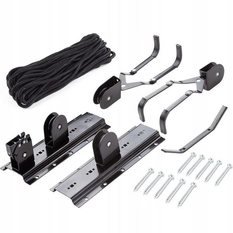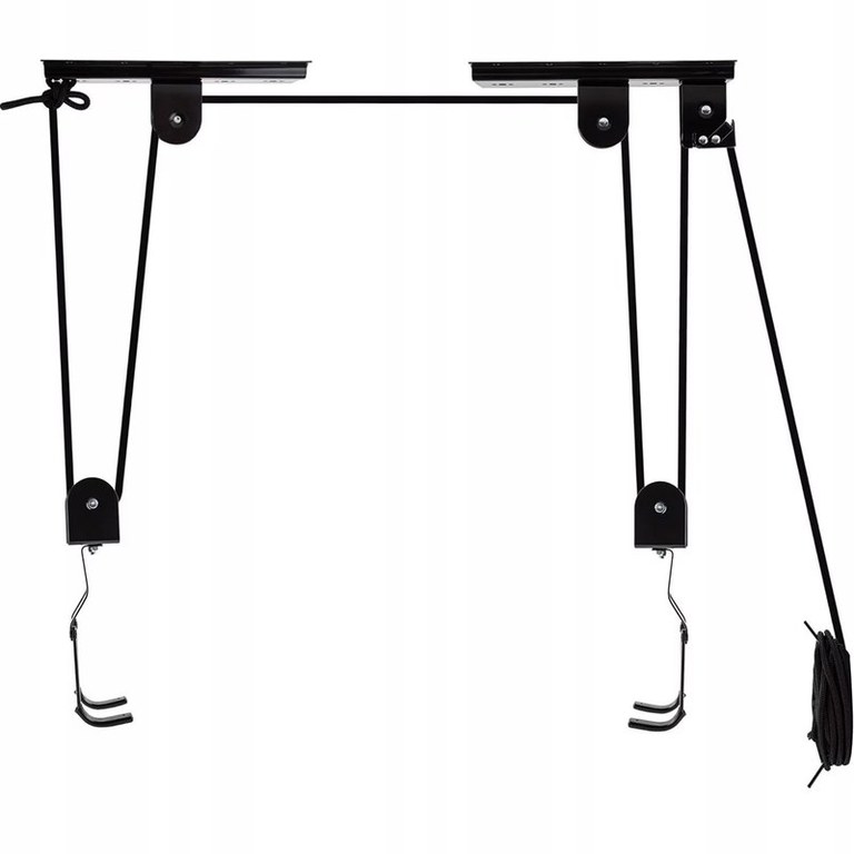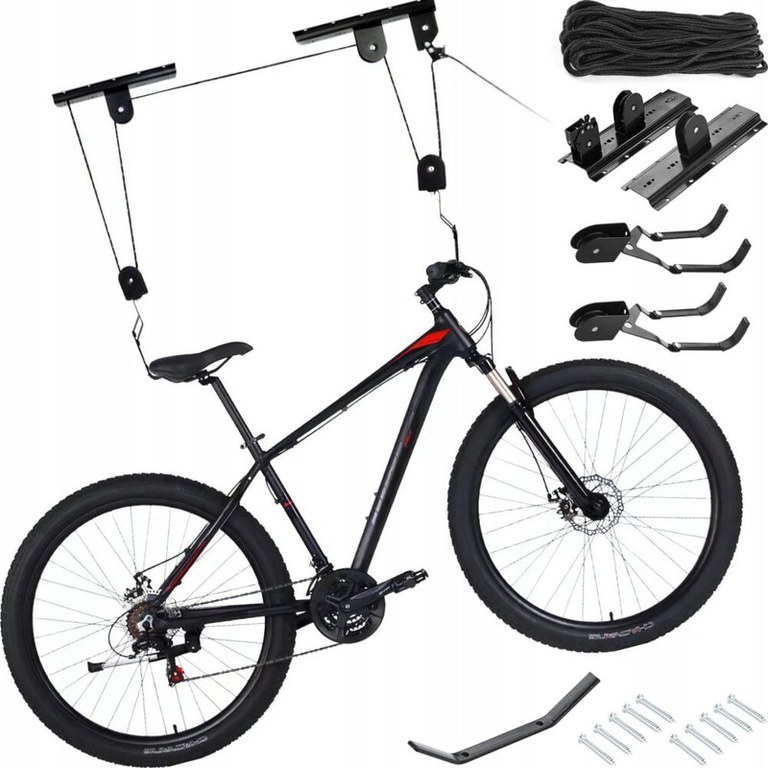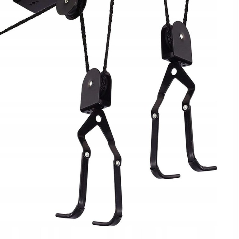 Descriere/nSuport suspendat Renew Force pentru depozitarea bicicletei , cu prindere in tavan, sarcina maxima suportata 20 Kg, Negru/n /n/n /nDepozitarea in siguranta a echipamentelor in afara podelei – folosind doua carlige (instalate sub sa si pe ghidon) si franghia inclusa in set, iti poti agata usor si rapid bicicleta de tavan, economisind astfel spatiu in garaj sau atelier. Setul include toate elementele necesare pentru asamblarea cuierului./n /n /n20 kg capacitate maxima de greutate/nEste important sa cititi si sa respectati aceste instructiuni! Nerespectarea acestui lucru poate duce la vatamari corporale sau la deteriorarea bunurilor/nInstructiuni de montare/nPentru cele mai bune rezultate montati ansamblurile de ridicare astfel incat carligele sa fie direct deasupra ghidonului si sezutului. Daca doriti, puteti monta intregul ansamblu pe o placa, apoi montati placa pe grinzile tavanului./n1. Masurati distanta dintre ghidon si sezut, locul unde se vor fixa carligele pentru bicicleta. Aceste masuratori vor fi transferate pe tavan sau pe placa./n2. Daca tavanul dvs. este acoperit cu gips-carton, cautati dispozitive de fixare. Acestea sunt indicii pentru localizarea grinzilor. Folositi un cui sau o surubelnita mica pentru a crea o gaura pilot in tavan, pentru a va asigura ca ati localizat grinda. Odata localizata grinda, masurati de la perete la grinda. Ulterior transferati masuratorile dintre sezut si ghidon de-a lungul grinzii, astfel incat accesoriile de ridicare sa se ridice. Daca intentionati sa montati ansamblurile de ridicare in directia opusa grinzilor, va trebui sa montati ansamblurile de ridicare pe o placa./n3. Legati un nod dublu la capatul franghiei, introduceti restul franghiei prin orificiul patrat al ansamblului ascensorului, continuati sa introduceti cablul prin scripetele ansamblului de ridicare asa cum se arata in imaginea de mai jos./n4. Folosind suruburile din lemn furnizate, montati pe fiecare dintre ansamblurile de ridicare (cate 3 suruburi) pe tavan, asigurandu-va ca cele 2 carlige se aliniaza cu masuratorile dintre ghidonului si saua dvs./n5. Folositi cele 2 suruburi din lemn ramase pentru a monta clema pentru cablu pe perete./n/nInstructiuni de utilizare/nRidicarea bicicletei/nCoborati carligele peste ghidonul si sezutul bicicletei, asigurati-va ca franghiile nu sunt rasucite./nRidicati bicicleta pe carlige./nBicicleta poate fi ridicata pana la tavan tragand de franghie, blocarea franghiei se va cupla impiedicand bicicleta sa cada./nPentru siguranta, legati franghia de clema si infasurati excesul de franghie din jurul ei./nCoborarea bicicletei/nTrageti franghia spre scripetele din spate mentinand tensiunea pe franghie./nLasati incet cablul sa iasa in timp ce bicicleta coboara./nIn cazul in care lasati coarda sa iasa prea repede, se va bloca cablul./nCand bicicleta este jos, scoateti-o din carlige si ridicati carligele in tavan./nPastrati excesul de franghie in jurul clemei pentru franghie./nAceast suport pentru bicicleta nu numai ca economiseste spatiu, dar protejeaza impotriva zgarieturilor. Cu scripetele este foarte usor sa lasati bicicleta in sus si in jos. Materialul pentru fixarea suspensiei bicicletei este inclus si puteti monta usor suspensia singuri./nDetalii:/n• montare usoara si rapida a suportului/n• potrivit pentru subsol sau garaj/n• economisirea spatiului si depozitarea pneurilor/n• manipulare in siguranta prin blocarea carcasei/n• carlige acoperite din cauciuc pentru protectia impotriva zgarieturilor/n• include role de ghidare si suport stabil pe tavan/n• pana la 4m inaltimea plafonului/n• capacitate de aproximativ 20 kg/n• culoare: negru/n• 2 sine/n• 2 carlige pentru agatare/n• 15m funie cu atasament/n• 10 suruburi
