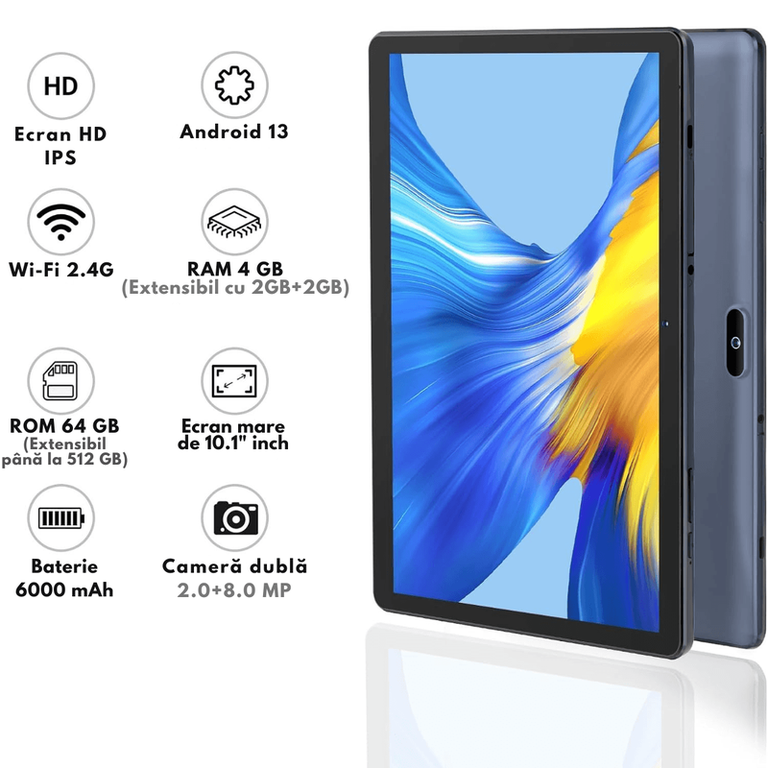 /nTableta Android 13 cu performanta optimizata pentru productivitate si divertisment/nDaca esti in cautarea unei tablete Android 13 de 10 inchi, care combina puterea, portabilitatea si eficienta, Pritom Tronpad este alegerea ideala pentru tine!/nAceasta tableta vine echipata cu un procesor Quad-Core optimizat pentru performante rapide si multitasking fluid, un ecran HD IPS de 10.1 inchi pentru imagini clare si culori vibrante, precum si o baterie de 6000mAh pentru o utilizare indelungata./n/nTableta ofera o capacitate de stocare de 64GB, extensibila pana la 512 GB cu un card microSD, si o memorie RAM de 4GB, ceea ce iti permite sa rulezi aplicatii, jocuri si pagini web fara intreruperi. Este ideala pentru lucru, scoala, streaming video, social media si navigare pe internet./n/n✅ Specificatii tehnice detaliate:/n/nSistem de operare: Android 13 – optimizat sistem pentru o experienta mai stabila si mai rapida./nProcesor: Quad-Core de inalta performanta, oferind o utilizare fluida si eficienta./nEcran: 10.1 inchi HD IPS, rezolutie 1280x800, luminozitate ridicata, unghiuri largi de vizualizare./nMemorie RAM: 4GB RAM (2GB + 2GB Expandabil), optimizata pentru multitasking./nStocare interna: 64GB ROM, cu suport pentru extindere pana la 512GB prin card microSD (cardul nu este inclus)./nBaterie: 6000mAh, autonomie extinsa de pana la 10 ore de utilizare mixta./nCamera foto: Dual Camera, camera frontala de 2MP si camera principala de 8MP, ideala pentru apeluri video si fotografii./nConectivitate:/n/nWi-Fi 2.4G pentru navigare rapida pe internet./nGPS integrat, perfect pentru navigatie si aplicatii de harti./nUSB-C pentru incarcare rapida si transfer de date./nJack pentru casti 3.5mm pentru o experienta audio excelenta./n/n/nSunet premium: Difuzoare duale stereo pentru un sunet clar si puternic./nDesign elegant si portabil: Constructie subtire si usoara, ideala pentru calatorii, scoala sau birou./n/n/n/n✅ Ideala pentru:/n✔️ Copii si elevi – perfecta pentru lectii online, aplicatii educationale si jocuri interactive.✔️ Seniori – ecran mare si clar pentru vizionare confortabila a filmelor si citirea cartilor digitale.✔️ Profesionisti si studenti – excelenta pentru emailuri, browsing, documente si apeluri video.✔️ Divertisment si multimedia – streaming pe YouTube, Netflix, Facebook, TikTok, Zoom si multe altele./n? Pachetul include:/n/n1 x Tableta VisionHub Tronpad 10"/n1 x Incarcator rapid/n1 x Cablu USB-C/n1 x Manual de utilizare/n/n/n? Cumpara acum tableta Pritom Tronpad si bucura-te de o experienta rapida si fluida! ?/n