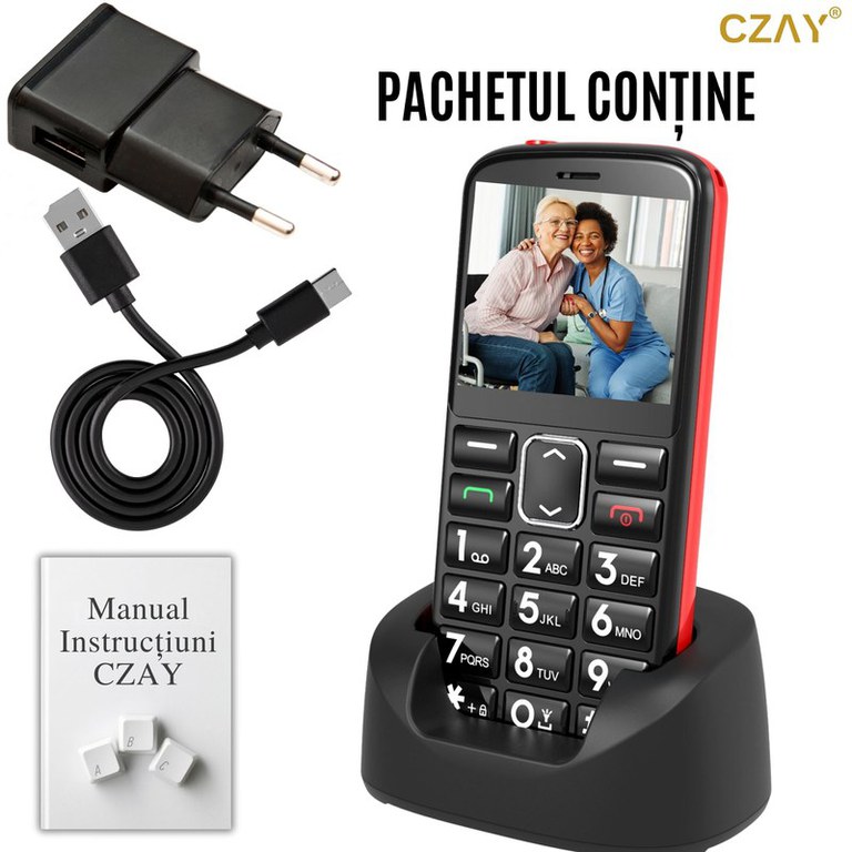 ☎️ Telefon mobil simplu si eficient, creat special pentru senioriTelefonul mobil CZAY pentru persoane in varsta cu butoane si fonturi mari, pictograme de meniu clare, este ideal pentru persoanele in varsta, oferind functionalitate usor de inteles si acces rapid la cele mai importante optiuni. Datorita tastelor mari si ecranului color de 6 cm avand o rezolutie de 320*240 pixeli, volumului puternic si sunetului clar in difuzor, utilizarea telefonului devine o experienta simplificata si confortabila, chiar si pentru cei cu dificultati de vedere sau dexteritate redusa. ☎️ Unul dintre cele mai mari ecrane disponibile pentru telefoane destinate seniorilor Ecranul LCD color de 6 cm ofera o rezolutie de 320 x 240 pixeli, asigurand o vizualizare clara si usor de citit. Dimensiunile generoase ale acestuia faciliteaza utilizarea telefonului de catre persoanele cu dificultati de vedere, oferind o experienta confortabila si fara complicatii.☎️ Volum puternic si reglabilPentru cei care au dificultati de auz, acest telefon cu butoane mari vine cu volum puternic reglabil printr-un buton lateral usor de utilizat. Astfel, utilizatorii pot ajusta volumul la nivelul dorit fara a naviga prin meniuri complicate. ☎️ Compatibilitate cu toate retelele din Romania – Conectivitate fara griji! Telefonul mobil M2302 este complet deblocat si compatibil cu toti operatorii de telefonie mobila din Romania, oferind libertatea de a alege orice retea in functie de preferintele utilizatorului. Functioneaza pe toate retelele 2G disponibile in Romania. Acest model suporta benzile de frecventa 850/900/1800/1900 MHz, ceea ce il face perfect pentru utilizarea cu: Orange, Vodafone, Digi Mobil, Telekom si alti operatori care utilizeaza retele 2G, avand semnal puternic si stabil in orice zona. ☎️ Autonomie indelungata si incarcare usoaraTelefonul mobil pentru batrani dispune de un acumulator de 1000 mAh, ce asigura o autonomie de pana la 7 zile in standby. Incarcarea se face rapid si usor, datorita portului USB-C si a bazei de incarcare, eliminand dificultatile intalnite de seniori la conectarea incarcatorului. Chiar daca telefonul CZAY este un model clasic, acesta include o camera foto functionala, perfecta pentru cei care isi doresc sa surprinda rapid momente importante din viata de zi cu zi. Aceasta permite realizarea de fotografii rapide, fie ca este vorba despre o intalnire cu familia, un peisaj frumos sau un eveniment important, usor de utilizat. De asemenea, telefonul clasic pentru batrani are o functionalitate extinsa permitand atat inregistrarea video (utilizatorii pot filma momente speciale, fie ca este vorba despre nepoti care se joaca sau un mesaj video pentru cei dragi), cat si inregistrare audio (telefonul poate fi folosit si ca reportofon, pentru a memora informatii importante sau a pastra mesaje vocale emotionante). Chiar daca este un telefon clasic, telefonul mobil pentru bunici iti ofera posibilitatea de a surprinde si pastra momentele care conteaza cu adevarat! Memoria telefonului poate fi extinsa printr-un card microSD T-FLASH de pana la 32GB, permitand pastrarea mai multor poze si videoclipuri. Fotografiile pot fi vizualizate direct pe ecranul telefonului, fiind usor de accesat oricand. ☎️ Dual SIM si functii suplimentare utileTelefonul pentru pensionari este compatibil cu toate retelele 2G din Europa si are functie Dual SIM, permitand utilizarea a doua numere de telefon simultan. In plus, ofera o serie de functii esentiale, cum ar fi Radio FM, Bluetooth, Calendar, Alarma, Inregistrare, Calculator, Blocare taste, Afisare ora si data, inregistrare video, inregistrare audio, player muzical, player video si chiar o Lanterna practica. ☎️ Acest telefon pentru seniori, cu butoane mari si functii simple si Meniu facil si intuitiv, disponibil in limba romana si alte limbi europene, fara functii inutile care sa ingreuneze utilizarea este solutia perfecta pentru cei care cauta un telefon clasic, usor de utilizat, cu toate functiile necesare pentru siguranta si confort in utilizare. Cadoul ideal pentru parinti, bunici sau orice persoana care doreste un telefon usor de folosit si de incredere. ☎️ Pachetul dumneavoastra contine: Telefon mobil penru persoanele in varsta Acumulatorul de 1000 mAh Baza de incarcare Cablu de incarcare USB Tip C Manual de utilizare in limba romana