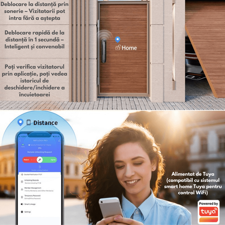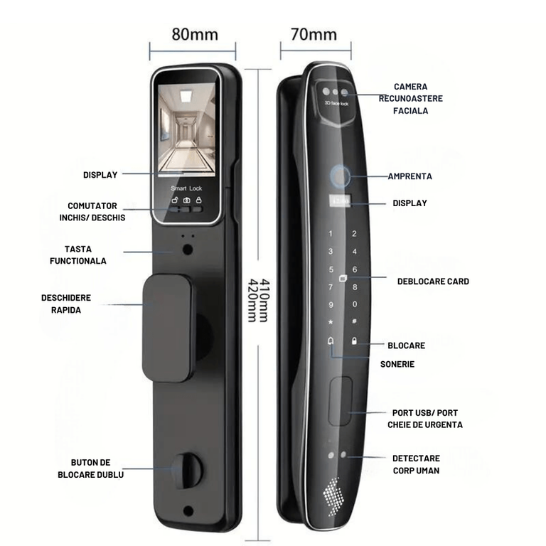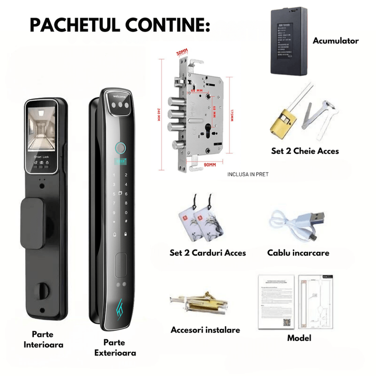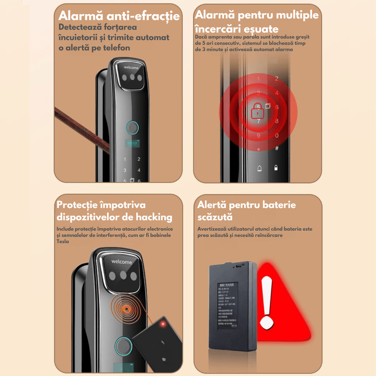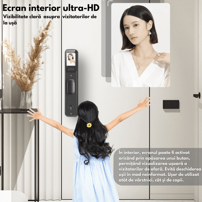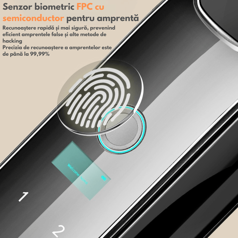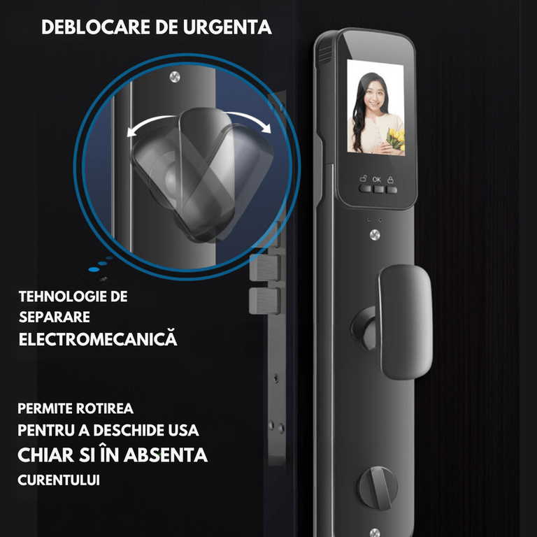 Incuietoare inteligenta cu recunoastere faciala 3D, amprenta, parola si control WiFi - Securitate avansata pentru casa ta.? Securitate avansata,/ntehnologie de ultima generatie si control smart de la distanta! Aceasta incuietoare/ninteligenta WiFi este solutia ideala pentru protectia casei tale. Datorita/nsistemului inovator de recunoastere faciala 3D, a cititorului de/namprenta digitala, a accesului prin parola numerica si deblocarii/nde la distanta prin aplicatia mobila, aceasta yala smart iti ofera/nun nivel de siguranta superior.✅ Caracteristici principale/nale incuietorii inteligente:? 1. Recunoastere faciala/n3D - Tehnologie avansata pentru deblocare instantanee✔️ Deblocare prin recunoastere/nfaciala 3D in mai putin de 1 secunda, fara contact fizic! Tehnologia de scanare/nfaciala 3D foloseste un sistem avansat de lumina structurata si algoritmi/nde inteligenta artificiala pentru o identificare precisa, chiar si pe timp/nde noapte./n✔️/nDeschidere fara atingere – nu mai trebuie sa folosesti chei sau sa te/nopresti in fata usii. Yala biometrica recunoaste rapid utilizatorii/nautorizati si permite accesul instant.? 2. Acces biometric prin/namprenta digitala - Precizie de 99,99%✔️ Cititor de amprenta/ndigitala ultra-rapid, cu o rata de recunoastere de 99,99% si timp de/nreactie sub 0,5 secunde./n✔️/nTehnologie FPC Semiconductor, care elimina riscul utilizarii amprentelor/nfalse si ofera o securitate ridicata impotriva accesului neautorizat.? 3. Deblocare prin/nparola numerica – Siguranta personalizata✔️ Seteaza parole de acces/npersonalizate pentru membrii familiei sau pentru musafiri./n✔️/nMod protectie anti-spionaj – poti introduce cifre suplimentare inainte/nsi dupa parola pentru a preveni furtul de date.? 4. Deblocare de la/ndistanta prin aplicatie WiFi – Control inteligent oriunde te afli✔️ Deschide usa de la distanta/nfolosind aplicatia mobila Tuya Smart sau Smart Life, disponibila/npe Android si iOS./n✔️/nMonitorizeaza in timp real cine intra si iese din locuinta, direct de pe/ntelefon./n✔️/nInterfon video in timp real – vezi si vorbeste cu vizitatorii tai/ninainte de a le permite accesul.? 5. Sistem de alarma/navansat – Protectie completa impotriva intrusilor✔️ Alarma anti-efractie –/ndetecteaza tentativele de fortare a incuietorii si trimite notificari pe/ntelefon./n✔️/nAlarma pentru introducerea gresita a parolei/amprentei – dupa 5/nincercari esuate, yala se blocheaza timp de 3 minute si emite o alerta./n✔️/nProtectie anti-hacking – impotriva atacurilor electronice si a/ndispozitivelor de tip "black box".? 6. Metode multiple de/nacces – Flexibilitate si confort✔️ 7 moduri de deblocare:/n Recunoastere/n faciala 3D/n Amprenta/n digitala/n Parola/n numerica/n Deblocare/n prin telefon (WiFi/Bluetooth)/n Card/n RFID (optional)/n Cheie/n mecanica de urgenta/n Deblocare/n de la distanta prin aplicatie/n? 7. Design modern,/ndurabil si baterie de lunga durata✔️ Materiale premium,/nconstructie din aliaj de zinc, rezistent la uzura si factori externi./n✔️/nEcran tactil HD cu iluminare inteligenta pentru vizibilitate excelenta./n✔️/nBaterie reincarcabila cu autonomie de pana la 6 luni. Dispune de alerta/npentru baterie scazuta si posibilitate de alimentare de urgenta prin/nport USB-C.? 8. Instalare usoara si/ncompatibilitate universala✔️ Compatibila cu usi din/nlemn, metal sau blindate, cu o grosime intre 38mm – 120mm./n✔️/nMontaj rapid, fara cabluri suplimentare. ? Pachetul contine:✔️ 1 x Incuietoare inteligenta/nbiometrica WiFi/n✔️/n2 x Chei mecanice de urgenta/n✔️/n1 x Cablu de incarcare USB-C/n✔️/n1 x Set accesorii pentru instalare/n✔️/n1 x Manual de utilizare in limba romana? Ideala pentru/napartamente, case, birouri, hoteluri si Airbnb!? Protejeaza-ti/nlocuinta cu cea mai avansata yala inteligenta! Comanda acum si bucura-te de/nsiguranta si confort la cel mai inalt nivel!/n
