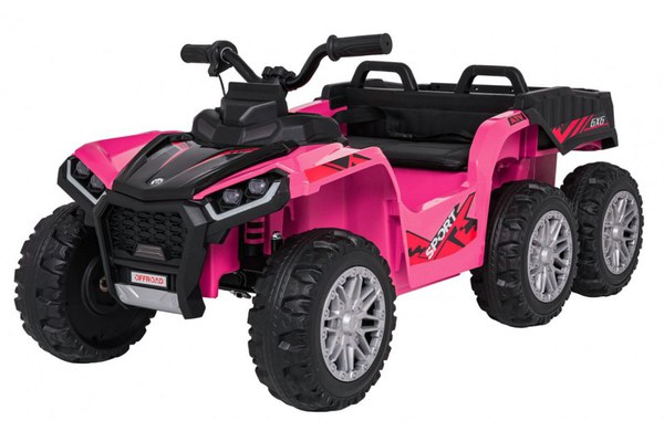 ATV-ul utilitar de culoare roz, este destinat copiilor intre 2 si 6 ani. Acesta are roti moi din cauciuc EVA, 4 motoare cu o putere totala de 180W, baterie de 12V 14Ah, tractiune 6x4, remorca si alte dotari.