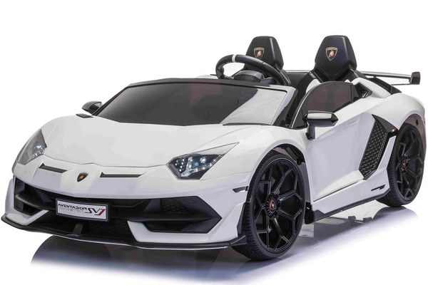 Lamborghini SVJ alb cu echipare premium, masinuta electrica cu bancheta dubla pentru 2 copii cu functie de dift, scaun tapitat cu piele ecologica, music player, roti moi, centura de siguranta.