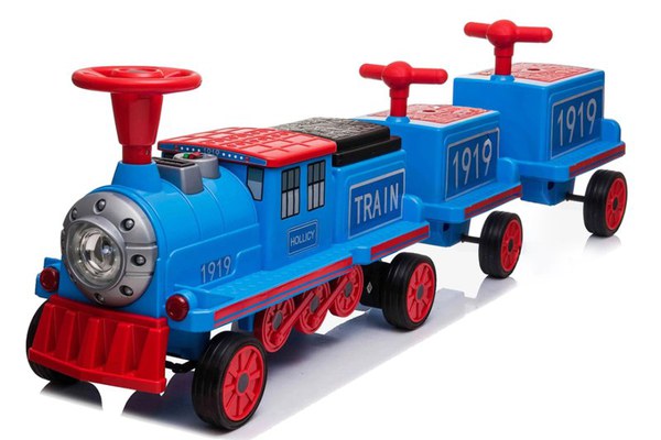 Trenulet electric cu vagon suplimentar model SX1919, albastru. Acest trenulet are 3 locuri ideal pentru 4 copii, roti moi, baterie 12V.