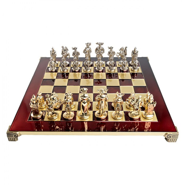 Combo set Piese sah din metal Cavalerii Medievali+Tabla de sah din metal rosu