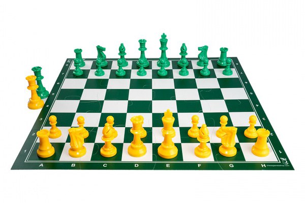 Un combo set excelent alcatuit din piese de plastic de tip Staunton colorat si o tabla tip Puzzle alb verde (dimensiune turneu)