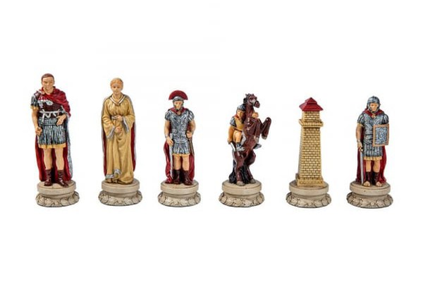 Un set deosebit de piese sah tematice din ceramica (rasini), pictate manual, inspirate din perioada Imperiului Roman Inaltimea regelui: 11 cm Inaltime regina: 10,5 cm Inaltime nebun: 10 cm Inaltime cal: 9,5 cm Inaltime turn: 9 cm Inaltime pion:...