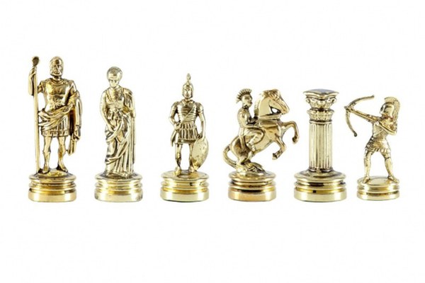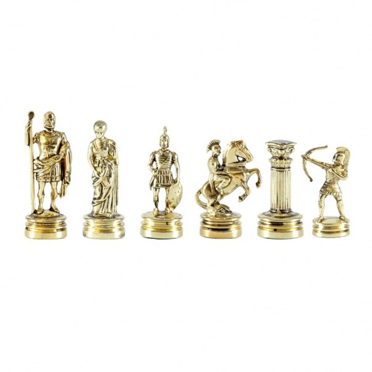 Aceste frumoase piese de sah nichelate din alama se bazeaza pe cultura greaca si romana si pe cuceririle lor militare. Pionii sunt reprezentati de un rand de arcasi, de unde vine si denumirea pieselor. Piesele de sah sunt turnate manual in zinc solid...