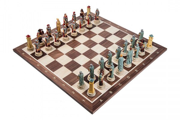 Un set deosebit de piese sah tematice din ceramica (rasini), pictate manual, inspirate din perioada Imperiului Roman alaturi de o tabla generoasa de sah din lemn de nuc si artar (walnut maple) intarsiat . Piesele au urmatoarele dimensiuni: naltimea...