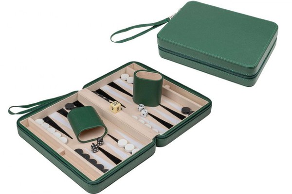 Un superb joc de table Backgammon de calatorie, magnetic Culoare: bej, negru, verde, alb Conținut: 1 zar de dublare, 4 zaruri, 15 piese de joc negre si 15 piese de joc albe, 2 cupe Material caseta: MDF, incrustatie din fetru, imitatie de piele...