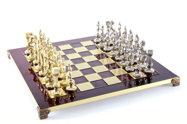 Acest complet set de sah de la producatorul grec Manopoulos include piesele de sah reprezentand personaje din perioada Evului Mediu si tabla de sah din alama. Tabla de sah vine in varianta rosie , patratele inchise la culoare fiind vopsite intr-un...