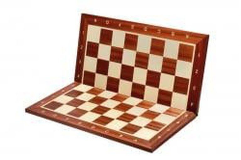 Tabla de sah din lemn pliabila de inalta tinuta cu cadru de mahon. Dimensiuni: 48 cm x 48 cm Grosime 14 mm Dimensiunea campului: 50 x 50 mm Greutate: 2 kg