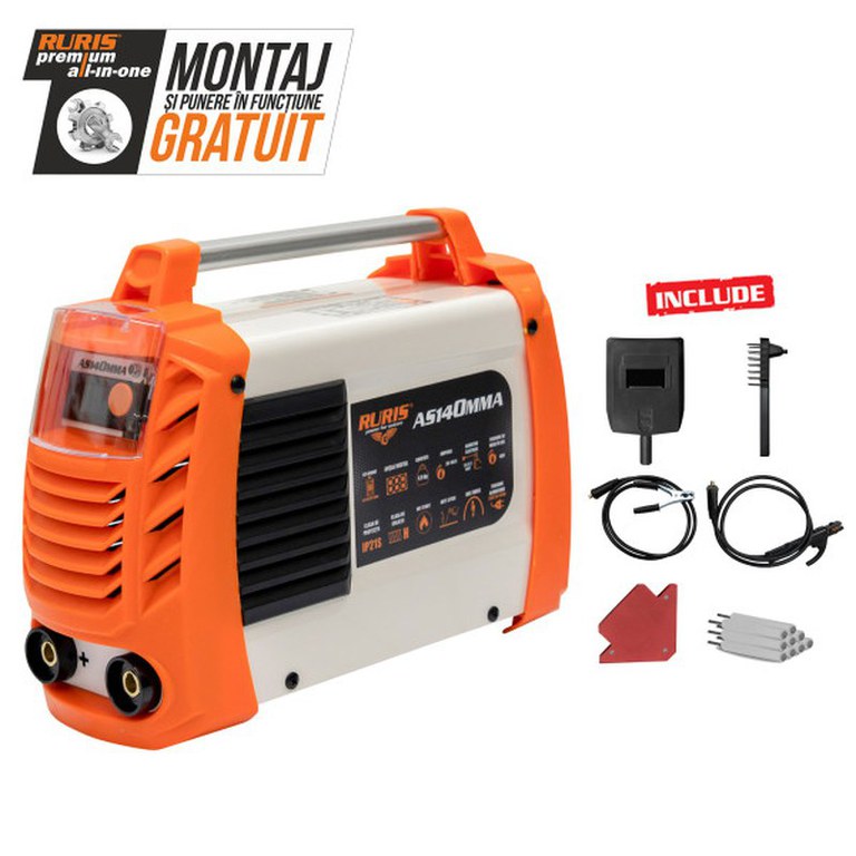 Aparatul de sudura RURIS AS140MMA, cu un amperaj de 140Ah, este un aparat de tip invertor de ultima generatie ce se deosebeste prin incorporarea tehnologiilor de ultim moment. Este usor, compact si excelent pentru utilizare. Are eficienta si performanta ridicata, aprindere usoara a arcului, formare excelenta a cordonului de sudura, volum mic si functionare simpla. ‚¬Â¢ Tehnica de sudura MMA Aparatul de sudura RURIS AS140MMA este destinat sudarii de tip MMA (cu electrozi inveliti) pentru lucrari de intretinere si reparatii. Ruris introduce gama de sudura cu arc (pentru electrozi) MMA de tip invertor, cu scara mare de amperaj, care are avantajul fata de sudura clasica cu tranformator prin prisma faptului ca aparatul este ergonomic, usor de transportat si poate asigura un control electronic al amperajului (intensitatii de curent de lucru). Aparatul de sudura RURIS AS140MMA poate sa lucreze cu electrozi bazici sau rutilici cu diametrul de 1.6 mm ‚¬a€œ 3.2 mm. Un amperaj mai mare inseamna o folosinta continua si mai lunga in timpul sudarii, precum si o gama mai larga de electrozi. Electrozii Ruris pot fi de doua categorii ‚¬a€œ Bazici si Rutilici ‚¬a€œ, alegerea acestora se face astfel: Electrozii Ruris Rutilici, sunt folositi in special pentru oteluri slab aliate, pentru suduri care necesita un aspect placut. Dupa formarea cordonului de sudura, pe suprafata sudurii ramane zgura care se desprinde singura. Totodata acesti electrozi Rutilici Ruris nu lasa urme de zgura sau stropi. Electrozii Ruris Bazici, sunt folositi mai mult pentru oteluri inalt aliate, dar si pentru cele slab aliate (table, tevi), iar dupa formarea cordonului de sudura, pe suprafata sudurii ramane zgura care trebuie indepartata prin lovirea acesteia cu un ciocan. Grosimea si tipul otelului ce trebuie sudat, viteza de lucru (sudura), grosimea electrodului de sudura, trebuie selectata in functie de amperajul pe care il ofera aparatul de sudura Ruris, pentru o rezistenta mare la sudura a materialelor. ‚¬Â¢ Functii inovatoare Inglobeaza cele mai noi tehnologii si functionalitati disponibile in acest moment. Afisaj digital: foarte usor de folosit fiind echipat cu un display care afisaza functiile select