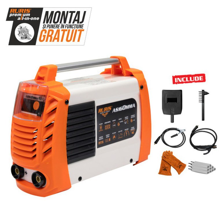 Aparatul de sudura RURIS AS160MMA, cu un amperaj de 160Ah, este un aparat de tip invertor de ultima generatie ce se deosebeste prin incorporarea tehnologiilor de ultim moment. Este usor, compact si excelent pentru utilizare. Are eficienta si performanta ridicata, aprindere usoara a arcului, formare excelenta a cordonului de sudura, volum mic si functionare simpla. ‚¬Â¢ Tehnica de sudura MMA Aparatul de sudura RURIS AS160MMA este destinat sudarii de tip MMA (cu electrozi inveliti) pentru lucrari de intretinere si reparatii. Ruris introduce gama de sudura cu arc (pentru electrozi) MMA de tip invertor, cu scara mare de amperaj, care are avantajul fata de sudura clasica cu tranformator prin prisma faptului ca aparatul este ergonomic, usor de transportat si poate asigura un control electronic al amperajului (intensitatii de curent de lucru). Aparatul de sudura RURIS AS160MMA poate sa lucreze cu electrozi bazici sau rutilici cu diametrul de 2.5 mm ‚¬a€œ 4 mm. Un amperaj mai mare inseamna o folosinta continua si mai lunga in timpul sudarii, precum si o gama mai larga de electrozi. Electrozii Ruris pot fi de doua categorii ‚¬a€œ Bazici si Rutilici ‚¬a€œ, alegerea acestora se face astfel: Electrozii Ruris Rutilici, sunt folositi in special pentru oteluri slab aliate, pentru suduri care necesita un aspect placut. Dupa formarea cordonului de sudura, pe suprafata sudurii ramane zgura care se desprinde singura. Totodata acesti electrozi Rutilici Ruris nu lasa urme de zgura sau stropi. Electrozii Ruris Bazici, sunt folositi mai mult pentru oteluri inalt aliate, dar si pentru cele slab aliate (table, tevi), iar dupa formarea cordonului de sudura, pe suprafata sudurii ramane zgura care trebuie indepartata prin lovirea acesteia cu un ciocan. Grosimea si tipul otelului ce trebuie sudat, viteza de lucru (sudura), grosimea electrodului de sudura, trebuie selectata in functie de amperajul pe care il ofera aparatul de sudura Ruris, pentru o rezistenta mare la sudura a materialelor. ‚¬Â¢ Functii inovatoare Inglobeaza cele mai noi tehnologii si functionalitati disponibile in acest moment. Afisaj digital: foarte usor de folosit fiind echipat cu un display ca