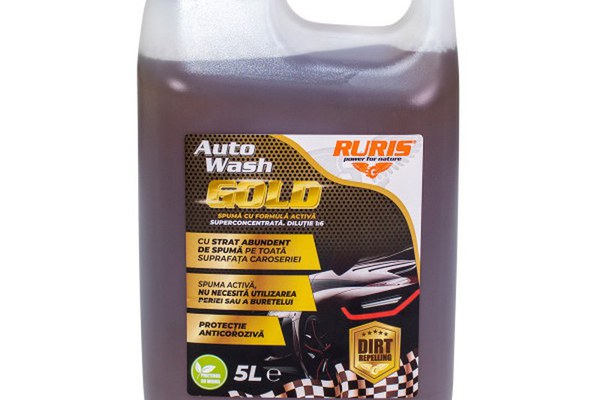 Auto Wash Gold este un detergent activ cu o formula super concentrata (dilutie 1:6), cu putere mare pentru curatarea rapida si facila a caroseriei si motorului. Potrivita atat pentru utilizarea alaturi de aparatele de curatat cu inalta presiune, cat si pentru spalarea manuala, in spalatoriile profesionale sau chiar in curtea casei tale, aceasta solutie nu necesita utilizarea periei sau a buretelui. Auto Wash Gold foloseste diluat cu apa (dilutie 1:6/1:80) in functie de natura si gradul de murdarie al suprafetelor de curatat precum si de tipul de instalatie folosit: manuala sau automata. Pentru o dozare corecta (1:6), la utilizarea Spalatorului cu presiune RURIS, la fiecare 100ml detergent se adauga 600ml apa, deci pentru a obtine 1l solutie preparata este necesar sa puneti aproximativ 145ml detergent si 855ml apa. Achizitionarea unui bidon de 5l de detergent, asigura 70 de spalari, cu un cost de aproximativ 1,7 lei/spalare. Solutia obtinuta se introduce in spalatorul cu presiune sau nebulizator, unde se formeaza, apoi se proiecteaza uniform de jos in sus pe suprafata ce urmeaza a fi curatata. Pentru usurinta in utilizare, este recomandata adaugarea in recipient mai intai a apei si mai apoi detergentul. Continutul trebuie mixat prin miscari lente, astfel incat sa nu se faca prea multa spuma in interiorul recipientului. O alta recomandare pentru obtinerea unei spume mai aerate este utilizarea de apa calda cand se realizeaza dozarea. Permite dizolvarea in totalitate a stratului de murdarie de pe suprafetele autoturismelor, camioanelor si ambarcatiunilor in orice anotimp, asigurand o spalare usoara fara frecare, un luciu indelungat si fara pete. Formula inovatoare asigura curatarea in profunzime a depunerilor din trafic, precum si a depunerilor de ulei, grasimi, fum, insecte, deoarece contine inhibitori de coroziune si actioneaza asupra suprafetelor metalice, de aluminiu, plastic, cauciuc, sticla fara a produce efecte daunatoare asupra componentelor acestora. Este un detergent delicat cu mediul inconjurator, substantele continute in produs sunt biodegradabile conform criteriilor OCDE.Detalii tehnice