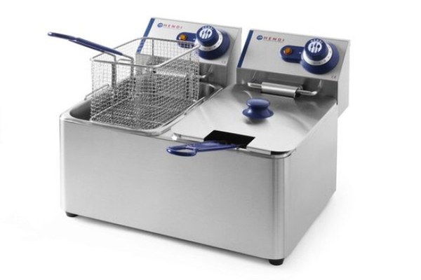 Friteuza electrica profesionala Blue Line, ideala pentru gastronomie si potrivita pentru uz casnic.Cartofi prajiti crocanti, gustosi, sunt serviti in aproape fiecare loc, asa ca merita sa investiti intr-un dispozitiv de inalta clasa.Friteuza Blue Line este folosita pentru a pregati cartofii prajiti perfecti, dar si pentru a praji portii de carne sau peste, legume sau gogosi.Friteuza electrica Blue Line este realizata din inox, iar posibilitatea scoaterii recipientului pentru grasime faciliteaza curatarea completa a dispozitivului si a tuturor componentelor sale.Temperatura friteuzei este controlata de un termostat ajustabil. De asemenea, un termostat suplimentar de siguranta protejeaza friteuza de supraincalzire precum si un element de control detasabil echipat cu protectie suplimentara creste nivelul de siguranta in timpul folosirii friteuzei electrice Blue Line.De asemenea friteuza electrica Blue Linei. este echipata cu un Led luminios care indica conectarea friteuzei la electricitate si o lumina de functionare a incalzitorului care va informeaza ca s-a atins temperatura dorita.Friteuza electrica Blue Line este echipata si cu o optiune moderna de „zona rece” astfel incat rezidurile rezultate din prajire cad in zona rece unde temperatura uleiului este mai mica si nu se ard repede. Recipientul pentru ulei este marcat un nivel minim si maxim de incarcare, toate materialele folosite la constructia friteuzelor sunt de cea mai buna calitate.Alimentare retea 220VSpecificatii:Friteuza profesioanala dubla, capacitate 2x 6 litri, corp din inox si vas ulei din inoxElementul detasabil cu sistem inchidere cand este scosVasul de ulei detasabil, face curatarea mai usoaraLampa de avertizare functionare a elementului de incalzireTemperatura poate fi reglata pana la 190 °CUn termostat de siguranta pentru evitarea supraincalziriiProtectie la supraincalzire, cu boton resetareUn cos de prajire cu maner lung, izolatZona rece, care imbu