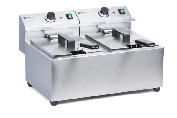 Friteuza electrica profesionala Hendi, ideala pentru gastronomie si potrivita pentru uz casnic.Cartofi prajiti crocanti, gustosi, sunt serviti in aproape fiecare loc, asa ca merita sa investiti intr-un dispozitiv de inalta clasa.Friteuza Hendi este folosita pentru a pregati cartofii prajiti perfecti, dar si pentru a praji portii mici carne sau peste legume sau gogosi..Friteuza electrica Hendi este realizata din inox, iar posibilitatea scoaterii recipientului pentru grasime faciliteaza curatarea completa a dispozitivului si a tuturor componentelor sale.Friteuzele de top din gama "Mastercook" sunt fabricate din otel inoxidabil 18/0.Ele au un element detasabil cu functie oprire/pornire cand este indepartat.Cosul de prajire poate fi de asemenea indepartat pentru o curatare mai usoaraLampile de avertizare ale temperaturii se gasesc pe partea superioara a echipamentuluiUn termostat asigura friteuza sa nu se supraincalzeasca si poate fi repornit prin intermediul butonului de resetare aflat sub element. Cosul de prajire cu maner lung transforma acest model intr-o piesa fina a echipamentelor cu utilizare intensivaToate friteuzele se livreaza cu cos/cosuri de prajire si capac/capaceZona rece, care protejeaza calitatea uleiului .Dimensiuni: 455x605x(H)355mm, 2x8 lt, 230 V, 2x3500 W. Greutate neta 15.3 kg.Temperatura friteuzei este controlata de un termostat ajustabil. De asemenea, un termostat suplimentar de siguranta protejeaza friteuza de supraincalzire precum si un element de control detasabil echipat cu protectie suplimentara creste nivelul de siguranta in timpul folosirii friteuzei electrice Hendi.Hendi va ofera o gama variata de friteuze profesionale cu alimentare electrica ori pe gaz, cu o cuva sau doua, de capacitate mica sau mare, pentru orice bucataria profesionala indiferent de capacitatea ei. Alegeti cel mai bun raport calitate pret pentru echipamente produse cu ultima tehnologie, dedicate nevoilor dvs.Va oferim posibilitatea sa alegeti dintr-o gama larga de friteuze profesionale, avand ca principii eficienta si consumul redus de ulei. Ideale pentru orice bucatarie de top, restaurant, fast-food, cantina sau autoservire