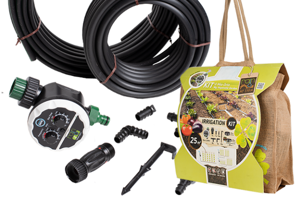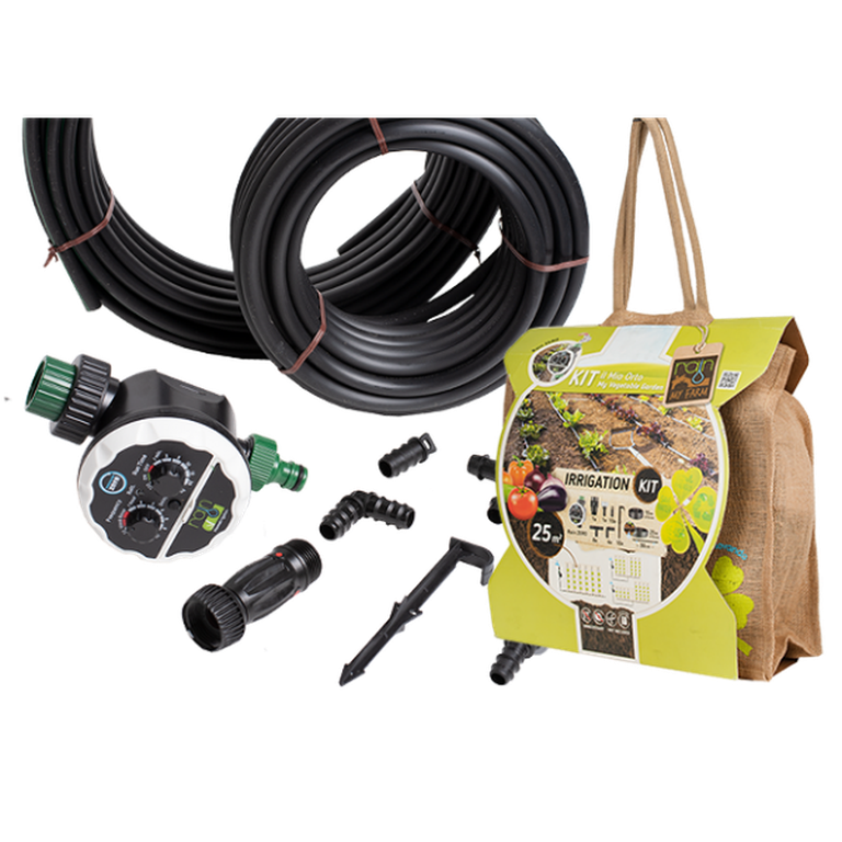 Irigarea prin picurare este cea mai usoara si eficienta modalitate de udare. Pentru a o face si mai accesibila pentru dvs., am ales acest kit „Fa-ti singur” pentru irigare prin picurare in gradina sau sera. Kit-ul de irigare My Farm Vegetable garden Include toate produsele necesare cu care puteti sa realizati singuri un sistem de irigare prin picurare pentru: legume, flori sau alte plante, pe o suprafata de maxim 25 de metri patrati.: - Programator de irigare automat Zero - Regulator de presiune - Teava PE cu lungimea de 15 metri si dimensiunea de ∅16 mm - Tub de picurare cu lungimea de 25 metri, dimensiunea de ∅16 mm si ciuperci pentru picurare incorporate la 30 cm - Teu pentru tub de picurare (8 buc.) - Mufa de legatura (4 buc.) - Suport fixare tub (10 buc.) - Dop pentru tub de picurare (10 buc.). Kit-ul ajunge la dumneavoastra intr-o geanta confortabila, ceea ce il face o idee grozava de cadou pentru orice gradinar amator.