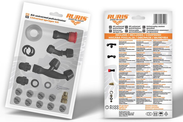 Kitul universal pentru pulverizator poate echipa toata gama de pulverizatoare RURIS, cu diuze interschimbabile. Diuzele pe care le contine kitul au o plaja variata de diametre pentru a putea acoperi toate lucrarile necesare in pomicultura sau alte aplicatii. Kitul universal pentru pulverizator este compus din urmatoarele componente: ‚¬Â¢ Duza conica dubla (diametru gauri: 2mm; debit 1,9l/min) ‚¬a€œ recomandat pentru pesticide si insecticide ‚¬Â¢ Duza sigal (diametru gauri: 2mm; debit 1,15l/min) ‚¬a€œ recomandat pentru pesticide si insecticide ‚¬Â¢ Duza reglabila (diametru gauri: 0.8mm; debit 1,7l/min) ‚¬a€œ recomandat pentru stropirea copacilor inalti si a pomilor fructiferi ‚¬Â¢ Duza din alama (diametru gauri: 2mm; debit 1,15l/min) ‚¬a€œ recomandat pentru pesticide si insecticide ‚¬Â¢ Duza cu 3 gauri ‚¬a€œ 3 seturi (diametru gauri: 0.8mm; debit 1,9l/min) ‚¬a€œ recomandat pentru orice tip de culture, suprafete mari si pulverizare rapida ‚¬Â¢ Kit garnituriDetalii tehnice