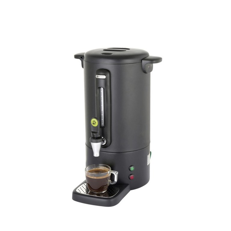 Percolator pentru bauturi fierbinti 7 litri, inox, negru mat, termostat 0-100 gr C, 1650 W, Concept Line Hendi, 307x330x(h)450 mmConceput pentru oaspetii dvs. in minte de renumitul designer olandez Robert Bronwasser.Designul unic si atentia acordata detaliilor fac din acest aparat un dispozitiv de calitate pe orice tip de bufet.Corp din otel inoxidabil, cu un singur perete, cu manere si capac din polipropilena elegante.Design unic pentru robinet fara picurare, cu sticla gradata integrata. Tava de scurgere este magnetica, poate fi scoasa fara a fi necesara ridicarea sau varsarea. Tava de filtrare are filtru incorporat pentru cafea macinata mare, nu este necesara hartie de filtru.Filtrele pastreaza cafeaua la temperatura de servire dupa preparare. Lumina indicatoare semnaleaza sfarsitul procesului de preparare si daca este necesara indepartarea calcarului.Alimentare la retea 220V