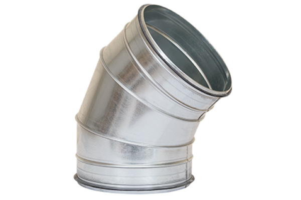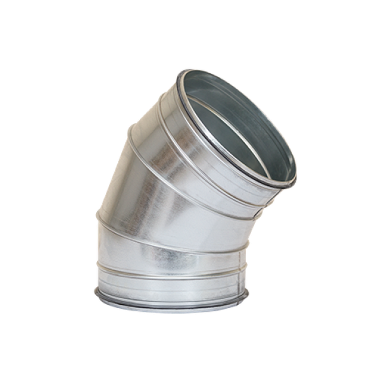 Cot de 45° din segmente faltuite din tabla de otel zincat cu garnituri de etansare (EPDM) la ambele capete.Se foloseste pentru schimbari de directie in plan orizontal, vertical si oblic.Cotul la 45° este fabricat din segmente faltuite de tabla de otel zincat si este utilizat pentru realizarea de diverse configuratii pentru tronsoanele de tubulatura atat flexibila cat si rigida, pentru schimbari de directie in plan orizontal si verticalCot circular din segmente faltuiteCotul intra in interiorul tubulaturii tip Spiro avand diametrul specificat.Material:Tabla zincataAlte detalii:dimensiunile reprezinta diametrul (mm) de conectare la tubulatura circulara tip SPIRO si unghiul (grade);raza mediana mica (rm=0,5*d1)