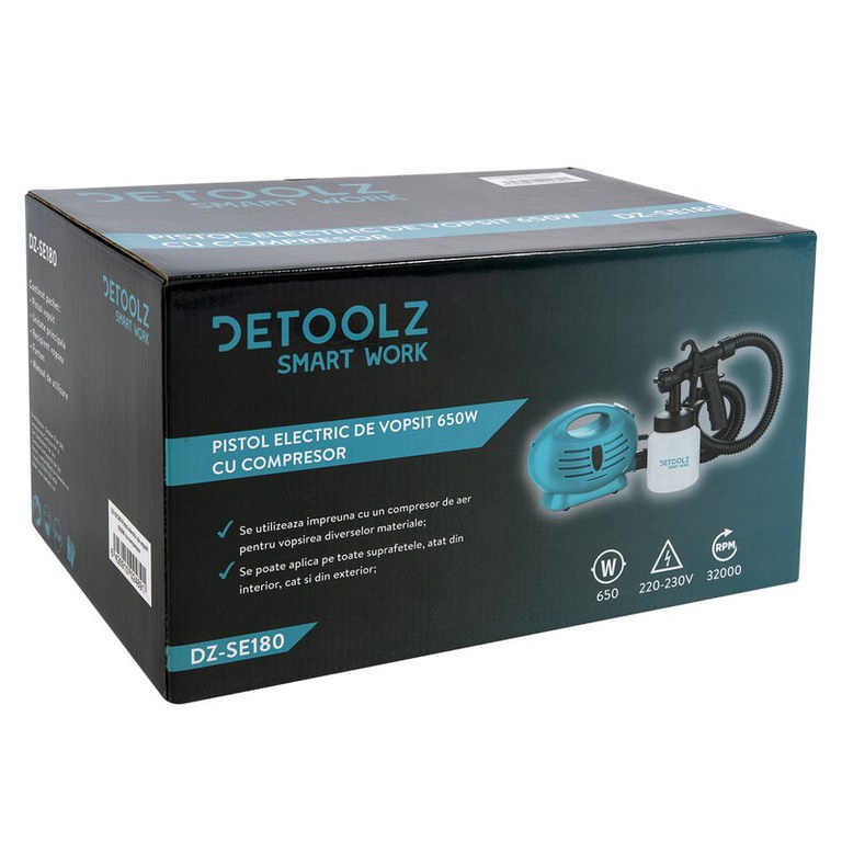 Specificatii tehnice:Brand: DetoolzCapacitatea rezervorului: 800 mlDiametru duza: Փ 2.6 mmDimensiuni: 350x227x198 mmFrecventa: 50 HzFurtun flexibil: 1.3 mGreutate bruta: 2.5 kgGreutate neta: 2 kgMaterial: PlasticNumar bucati/bax: 4 bucPutere de pulverizare: 105 WPutere KW/W: 650 WTensiune: 220 ÷ 230VTip produs: Pistol electric de vopsitTuratie: 32000 rot/minVascozitate maxima: 130 DIN-sDescriere produsPistolul electric de vopsit cu compresor, 650W, Detoolz DZ-SE180, este un produs de uz gospodaresc, proiectat pentru pulverizarea substantelor lichide pe diverse suprafete. Se utilizeaza impreuna cu un compresor de aer pentru vopsirea diverselor materiale. Se poate aplica pe toate suprafetele din interior si din exterior.Pistolul electric de vopsit cu compresor, 650W, Detoolz DZ-SE180 are urmatoarele caracteristici: Constructie robusta, din materiale de fabricatie de cea mai buna calitate, rezistente pentru o durata de viata extinsa; Extrem de practic si util; Se ajunge la colturile si unghiurile stranse pe care o rola normala nu le poate accesa; Fabricat din materiale ultra-usoare, durabile; Duza reglabila Produs cu raport pret/calitate excelent; Consum redus de energie; Trebuie folosit numai pentru destinatia pentru care a fost construit.Continut colet pistolul electric de vopsit cu compresor, 650W, Detoolz DZ-SE180: Pistol vopsit DZ-SE180;Unitate principala; Recipient vopsea; Furtun; Curea; Palnie pentru masurarea vascozitatii; Clip curatare;Manual de instructiuni.