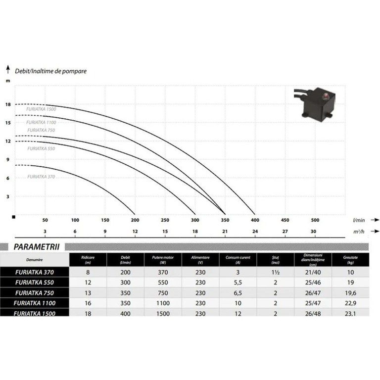 Descriere produs:O serie de pompe inundabile din fonta echipate cu un concasor.Pompele sunt destinate pomparii apelor uzate menajere si evacuarii apei din incaperile inundate. Pompele sunt echipate cu un sistem de concasare extrem de eficient de tip ”surub” care limiteaza la minim riscul de blocare. Pentru a asigura functionarea fara defectiuni, pompele au fost echipate cu o protectie impotriva supraincarcarii, montata pe cablu. In cazul riscului de supraincarcare a motorului, protectia va opri pompa. Structura din fonta face pompele sa fie rezistente la deteriorari mecanice si la coroziunea chimica. Pompele au fost echipate cu un intrerupator plutitor care permite functionarea automata a dispozitivului, iar stutul pompei permite conectarea unui furtun de refulare cu un colier sau o cupla rapida. Datorita structurii solide si a unui sistem extrem de eficient de concasare, pompele din seria Furiatka sunt una dintre cele mai populare pompe echipate cu concasor, de pe piata poloneza.Aplicatie:Pomparea apelor reziduale din fose septice pe langa gospodarii casnice si agricole si evacuarea apei din incaperi, case si garaje inundate. Pomparea apei de ploaie si a apei de suprafata din iazuri, lacuri si rauri, alimentarea ochiurilor de apa. Statii de epurare a apelor reziduale menajere.Specificatii tehnice:Racordare teava: 2"Inaltime de refulare: 18 mDebit maxim: 400 l/minPutere: 1500 WGreutate: 24 kgConditii de functionare:Temperatura maxima a lichidului 40°CTemper