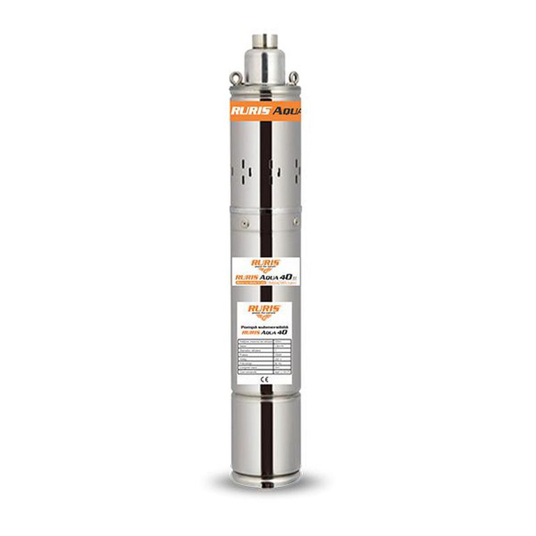 RURIS Aqua 104 este o pompa cu surub realizata din inox cu motorul in baie de ulei, bobinajul fiind 100% din cupru.Pompa se livreaza cu panou de control si un cablu de alimentare cu lungime de 30 m.Pompa submersibila RURIS Aqua 104 este o pompa de adancime care poate fi instalata in puturi si fantani forate la maxim 100 m adancime.Pompa poate alimenta cu apa curata gospodarii sau mici sisteme de irigatii, putand fi de asemenea si parte componeneta a unui sistem hidrofor.Specificatii Tehnice:Putere motor 1100WInaltime maxima refulare 100mAdancime maxima de scufundare 15mDebit 1,8m³/hNumar etaje Tip surubClasa de protectie IP68Temperatura maxima de lucru 35° CUtilizare ape CurateDimensiune maxima particule 0,05mmNumar de porniri/h 30Diametru de refulare 1,25”Diametru exterior pompa 4”Inaltime corp pompa 85 cmMaterial carcasa InoxRacire motor In uleiLungime cablu 30mBobinaj 100% CupruPanou control DaFlotor NuTensiune alimentare 230V/50HzGreutate 13.7 kg