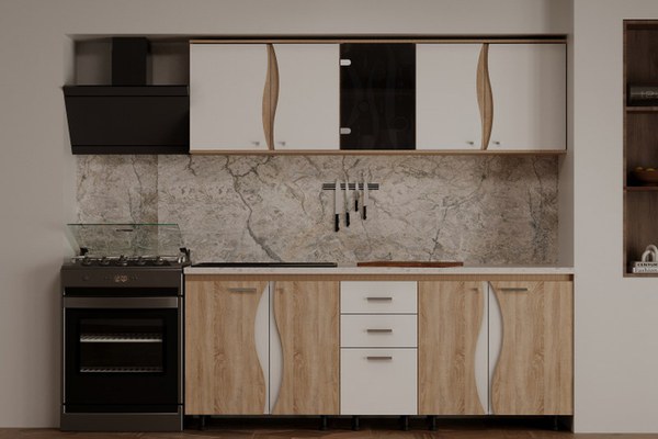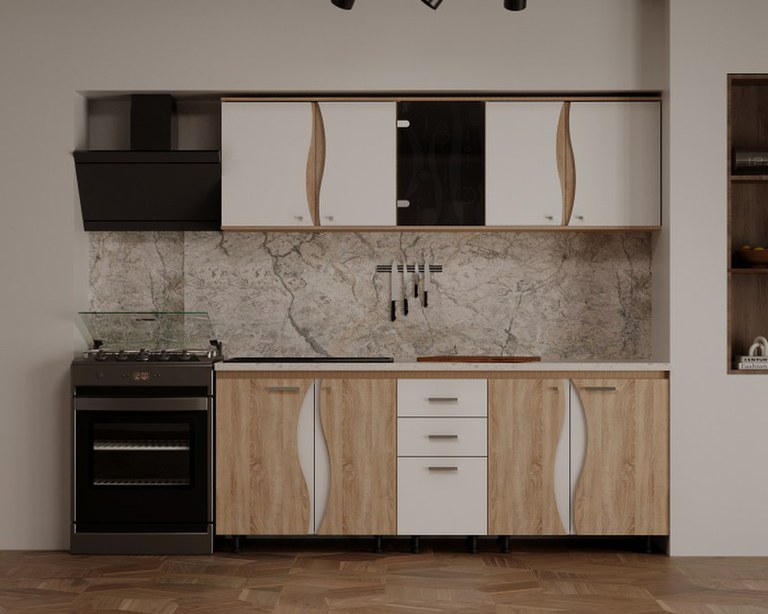 Material: Corp: Pal Melaminat Sonoma Front: Pal Melaminat Sonoma+Alb Dimensiune Bucatarie: Lungime 200 x Adancime 60 x Inaltime 200cm Dimensiuni corpuri: ( Lungime x Adancime x Inaltime ) Corp Inferior de 80cm ( x 1 buc. ) : 80 x 47 x 83cm...