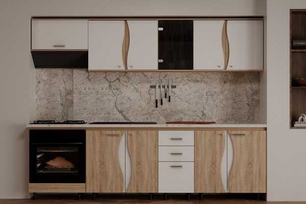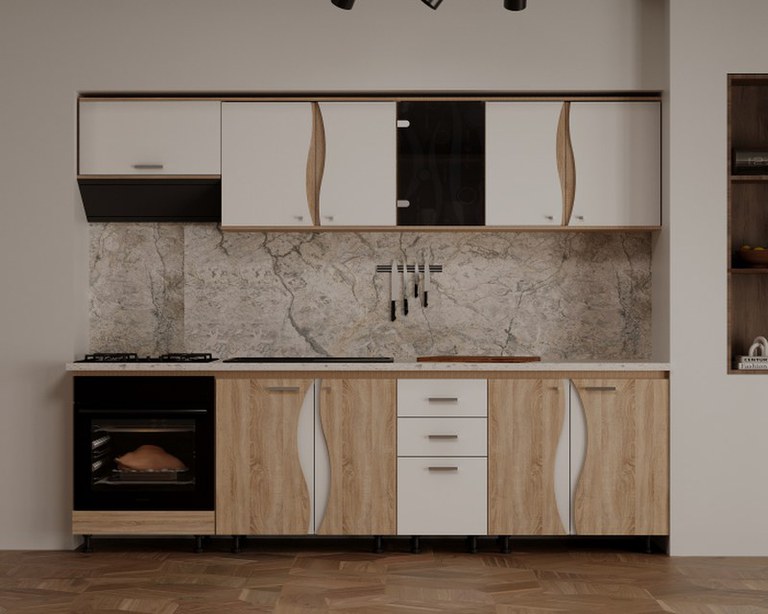 Material: Corp: Pal Melaminat Sonoma Front: Pal Melaminat Sonoma+Alb Dimensiune Bucatarie: Lungime 260 x Adancime 60 x Inaltime 200cm Dimensiuni corpuri: ( Lungime x Adancime x Inaltime ) Masca de Chiuveta 80cm ( x 1 buc. ): 80 x 47 x 83cm...